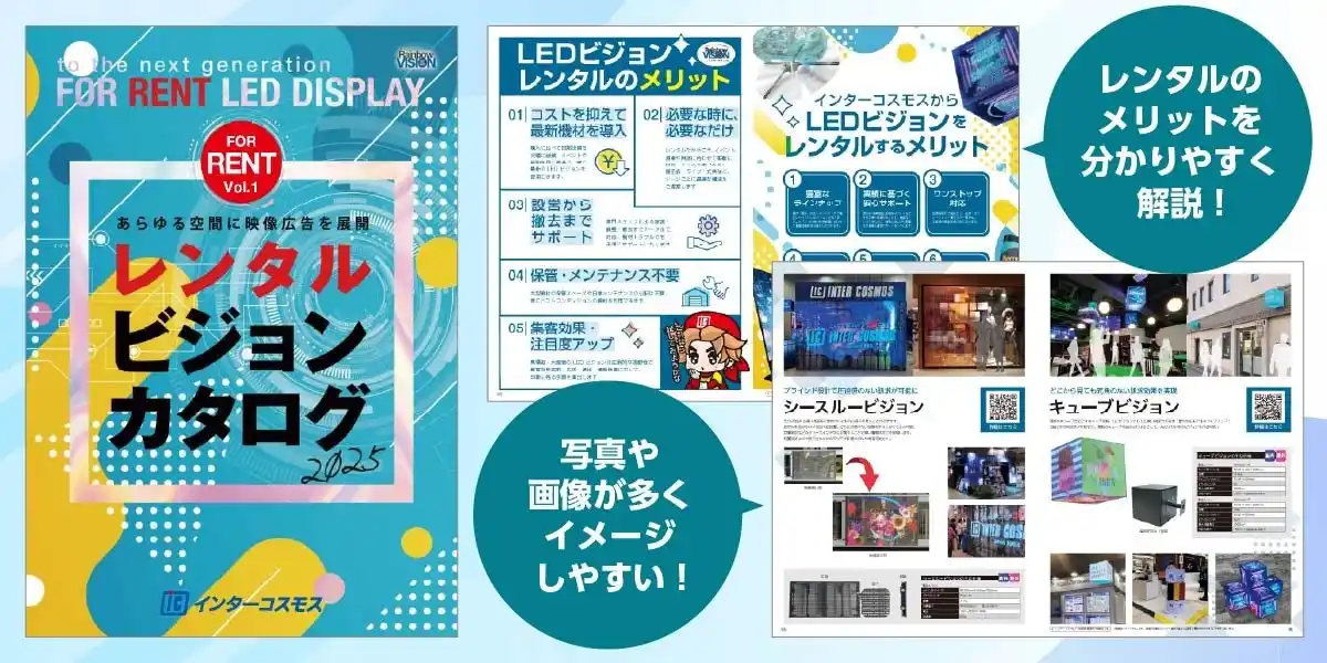 新商品追加に合わせ、レンタルビジョンカタログを全面リニューアルいたしました。 導入イメージを掴みやすい写真や画像を中心とした構成で、イベント企画や空間演出に役立つ内容になっています。 |