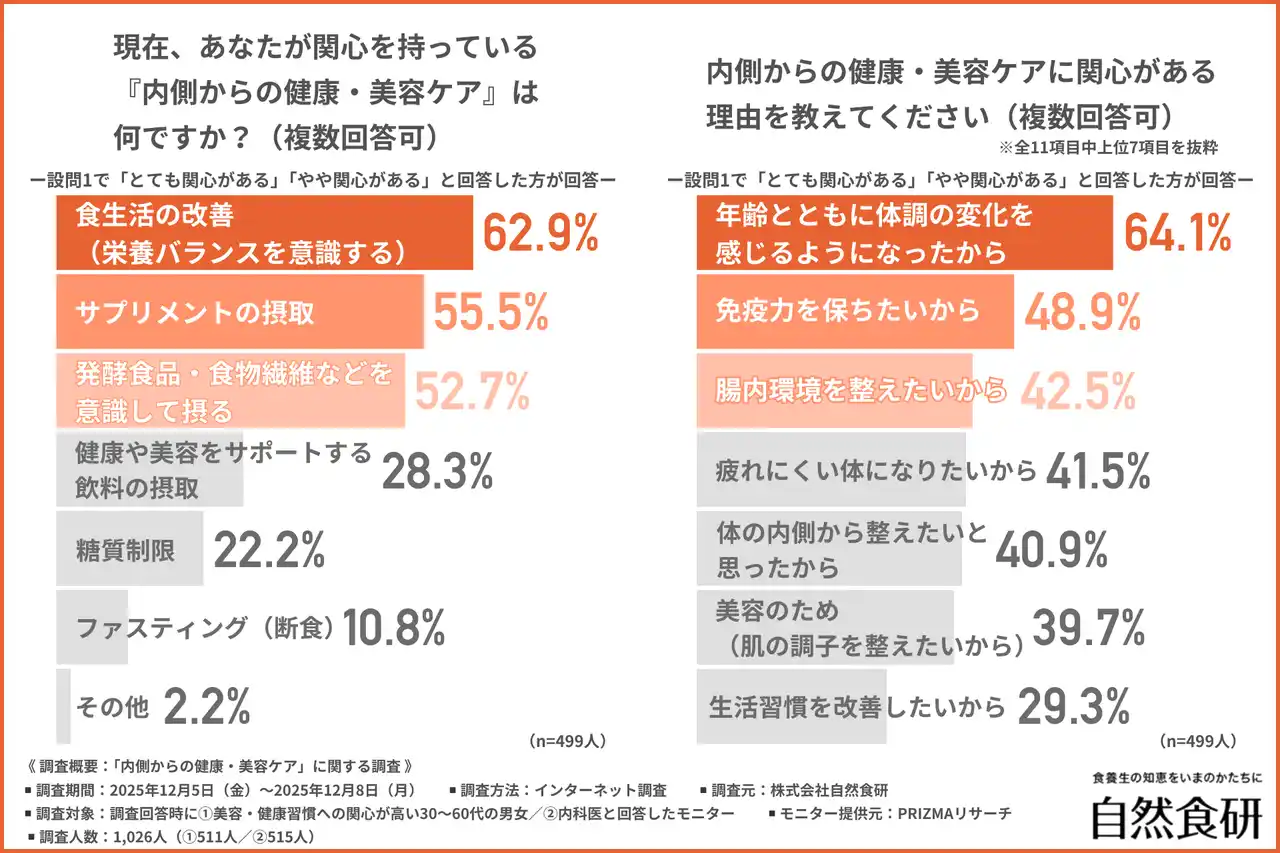 株式会社自然食研(所在地:大分県豊後高田市、代表者:佐々木 興平)は、1.健康・美容習慣への関心が高い30~60代の男女/2.内科医を対象に、「内側からの健康・美容ケア」に関する調査を行いました。