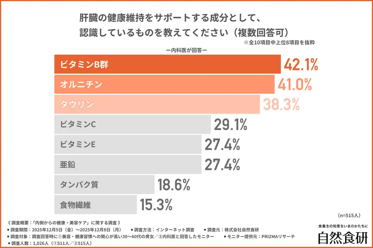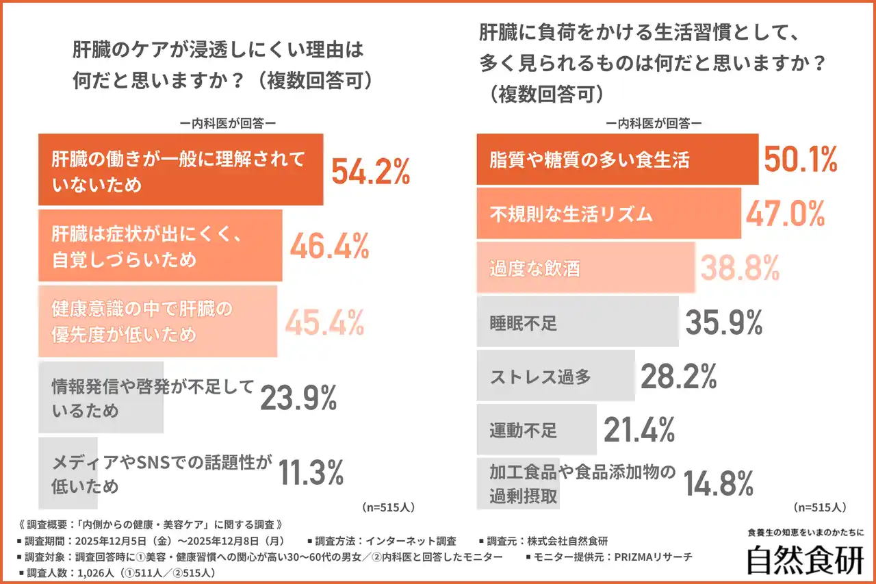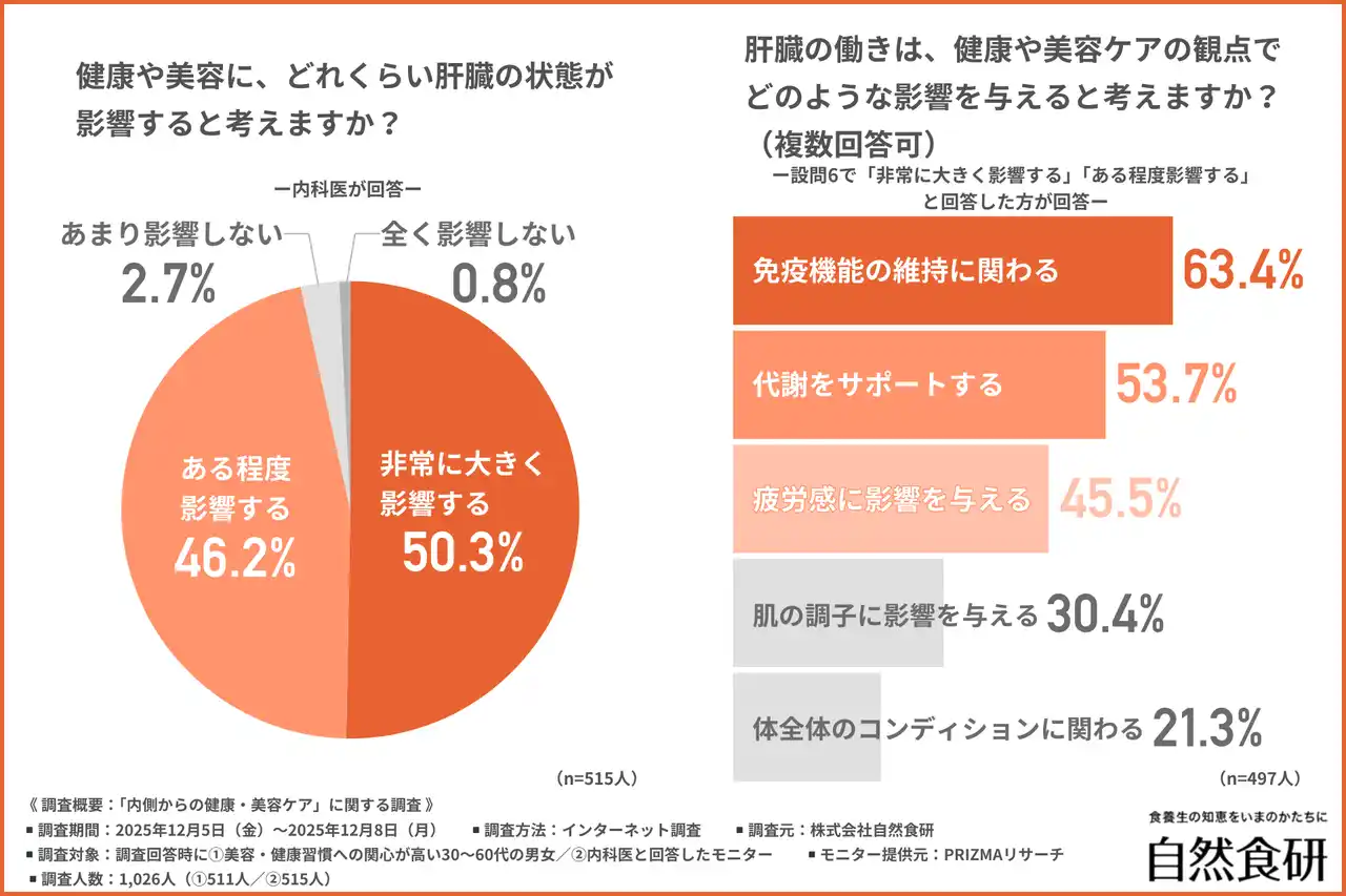 また、内科医への調査では、9割以上が「肝臓の状態は健康・美容に影響する」と回答し、特に「免疫機能の維持」や「代謝サポート」「疲労感」への影響が指摘されました。 |
