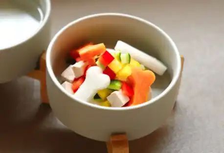 オプション:わんちゃん向けルームサービス コブサラダ(蒸し鶏、きゅうり、パプリカ、骨型の大根と人参)850円 |