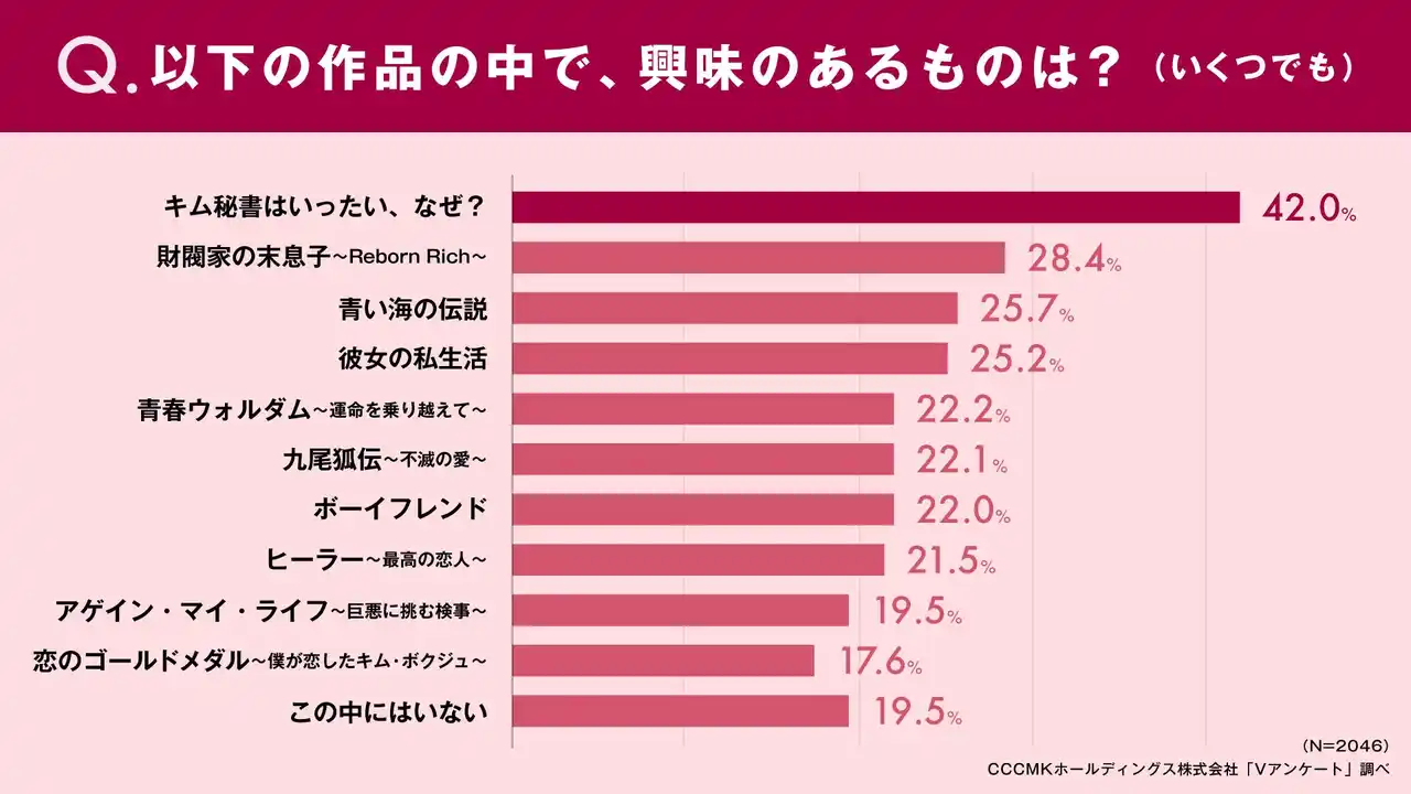 また、『韓流チャンネル』がオススメする10作品から「興味のある作品」を聞いたところ、1位「キム秘書はいったい、なぜ?(42.0%)」、2位「財閥家の末息子~Reborn Rich~(28.4%)」、3位「青い海の伝説(25.7%)」となりました。1位に輝いた「キム秘書はいったい、なぜ?」は、「視聴した中で名作だった作品」の7位にも選ばれており、ラブコメの王道を極めた胸キュン展開と、主演パク・ソジュンの魅力が視聴者の期待を高めていることがうかがえます。 |
