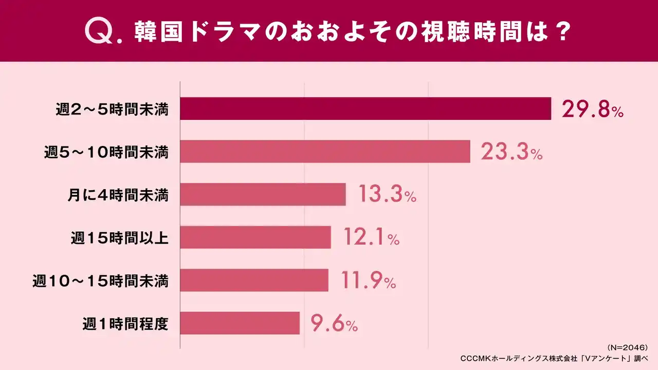 コンソーシアム型サービス「FASTチャンネル」の開発を行うFAST株式会社(本社:東京都渋谷区、代表取締役CEO:福崎伸也、以下「FAST」)と、BBM株式会社(本社:東京都渋谷区、代表取締役CEO:福崎 伸也、以下「BBM」)、CCCMKホールディングス株式会社(本社:神奈川県横浜市、代表取締役社長兼CEO:高橋誉則、以下「CCCMKホールディングス」)は、2025年11月7日(金)~11月13日(木)にかけて、女性V会員2,046名を対象に「韓国ドラマに関するアンケート調査」を実施しました。 |