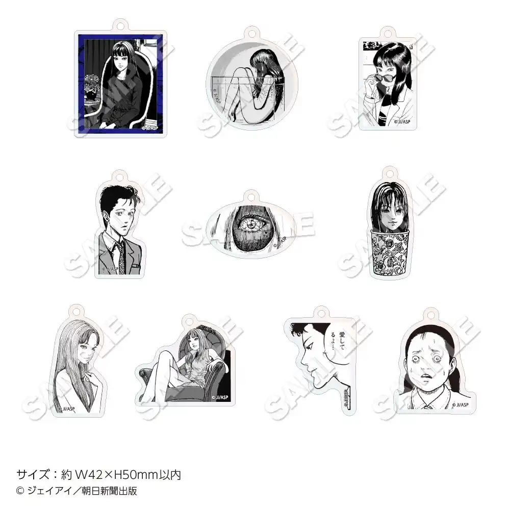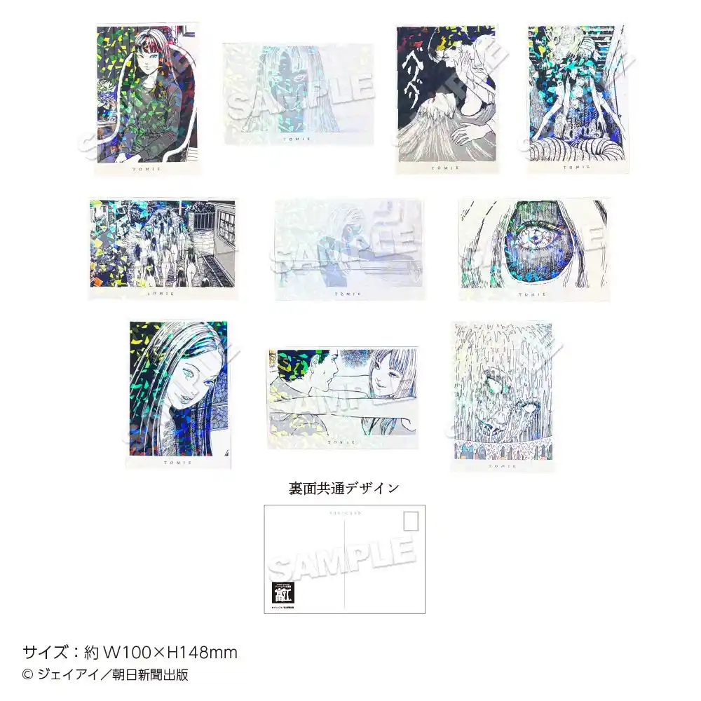 チケットホルダー、トレーディング缶バッジvol.1(全6種)・vol.2(全6種)、ラメアクリルアートボード、トレーディングポストカード(全10種)、ポストカードホルダー、缶ミラー(全3種)、三人の富江アクリルキーホルダー(全3種)、自ら増殖をはじめる富江巾着、自ら増殖をはじめる富江ブロックメモ、ステッカーセット(2枚入り)、クリアしおりセット、パネルガチャ(ミニアクリルチャーム全10種) |