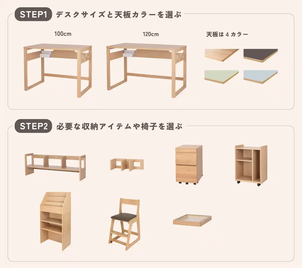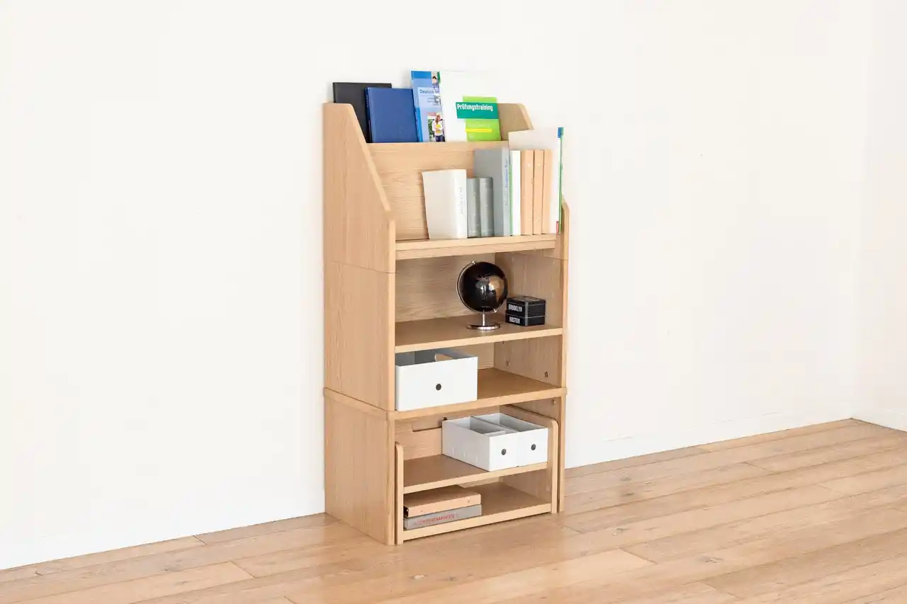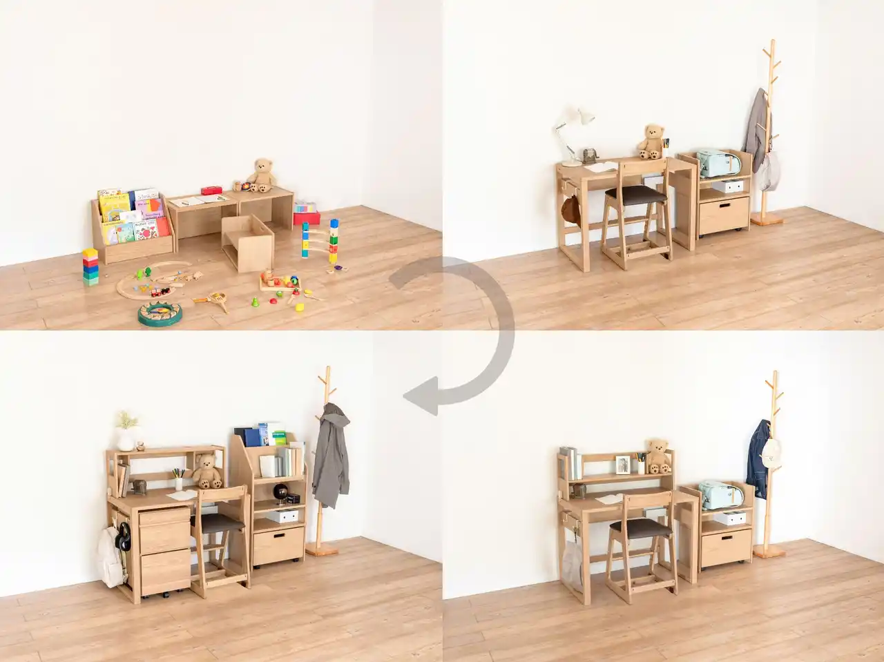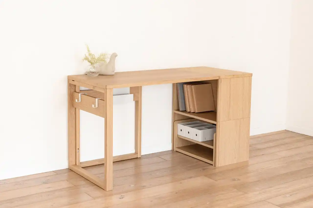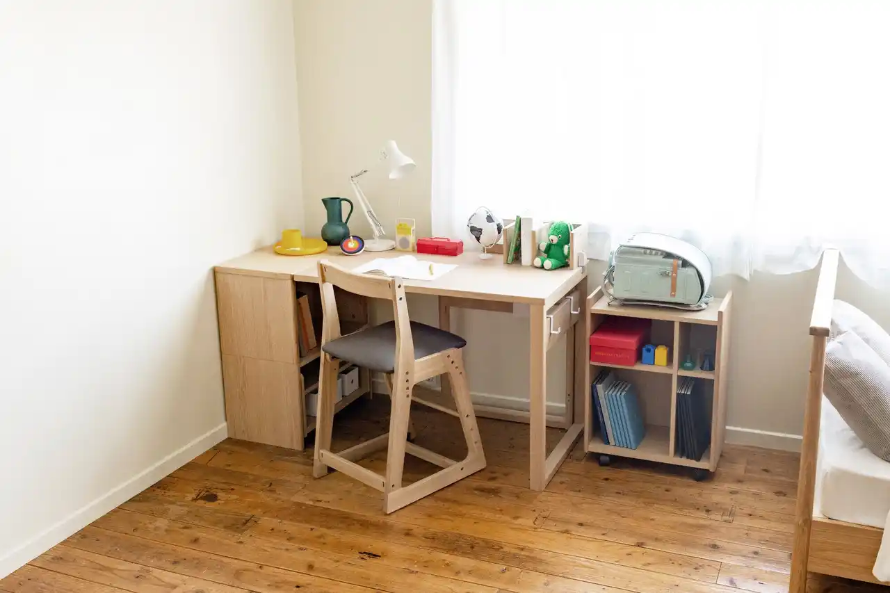 未就学児向けのキッズデスクは、成長後には形を変えて収納ラックとして使い続けられるなど、ライフステージに応じて用途を変えられる設計です。収納アイテムも必要なタイミングで買い足せるため、年齢とともに増えていく持ち物にも柔軟に対応でき、最適な環境を無理なくつくることができます。 |