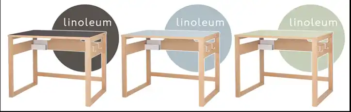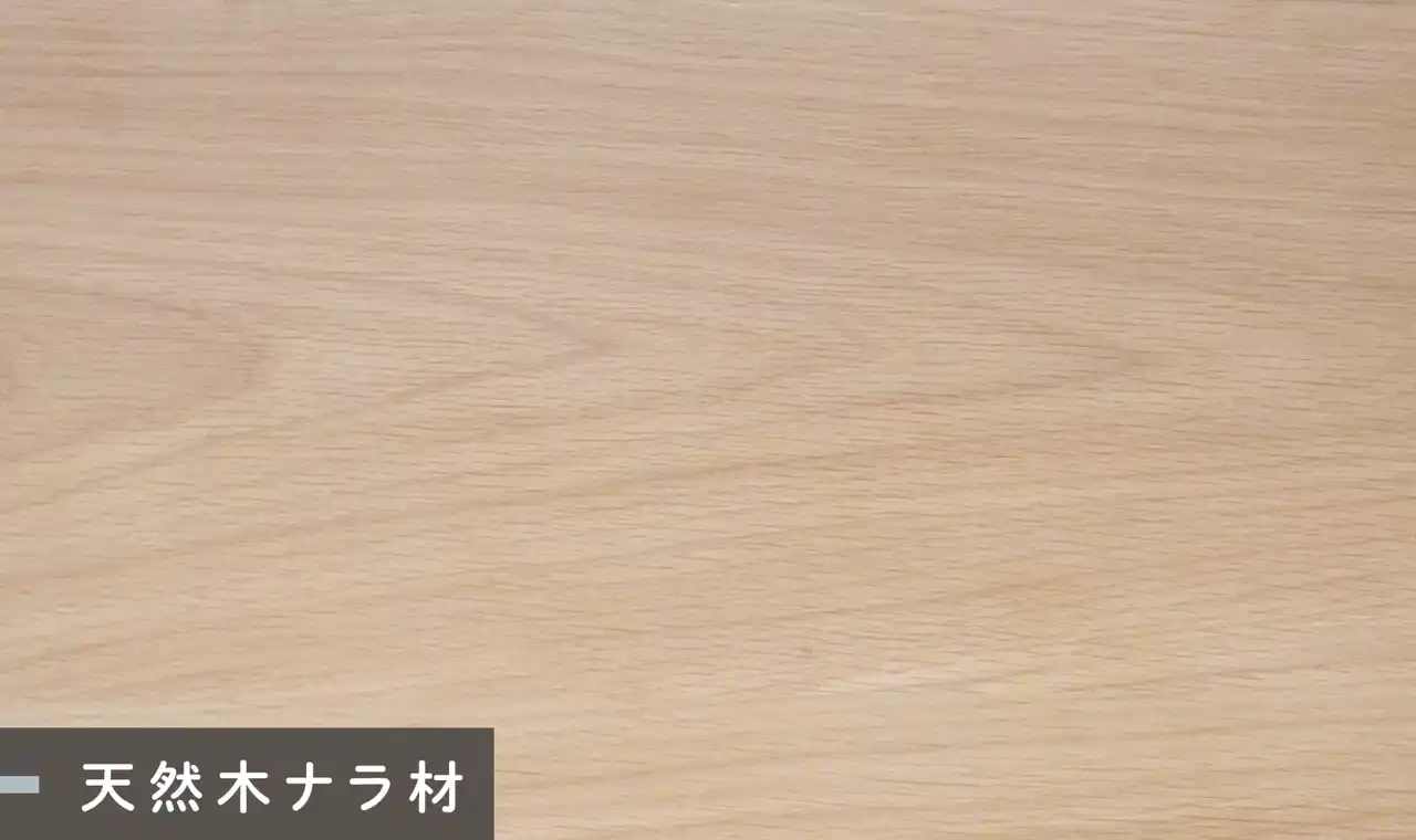 天板は、天然木ナラ突板(ナチュラル)と、亜麻仁油を主成分とした環境配慮素材「リノリウム」の3色、計4色から選べます。ナラ材は耐久性が高く傷がつきにくい一方、繊細で美しい木目がどんな部屋にも自然になじみます。リノリウム天板は抗菌性・耐久性を備え、しっとりとした手触りが特徴です。好みや空間の雰囲気に合わせて、長く愛せる質感を選ぶことができます。 |