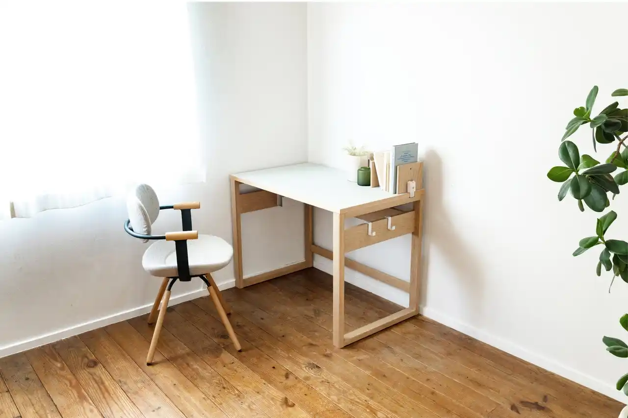 クレッタシリーズのデスクは、横から見たときにロの字型の脚部が生み出す “すっきりとした四角いシルエット”が特徴のシンプルで軽やかなデザインです。余計な装飾を省いた端正な形は、リビングにも子ども部屋にも自然になじみ、空間を圧迫しません。北欧・モダン系のインテリアとも相性が良く、成長してからも長く使い続けられる、飽きのこない佇まいを目指しました。 |
