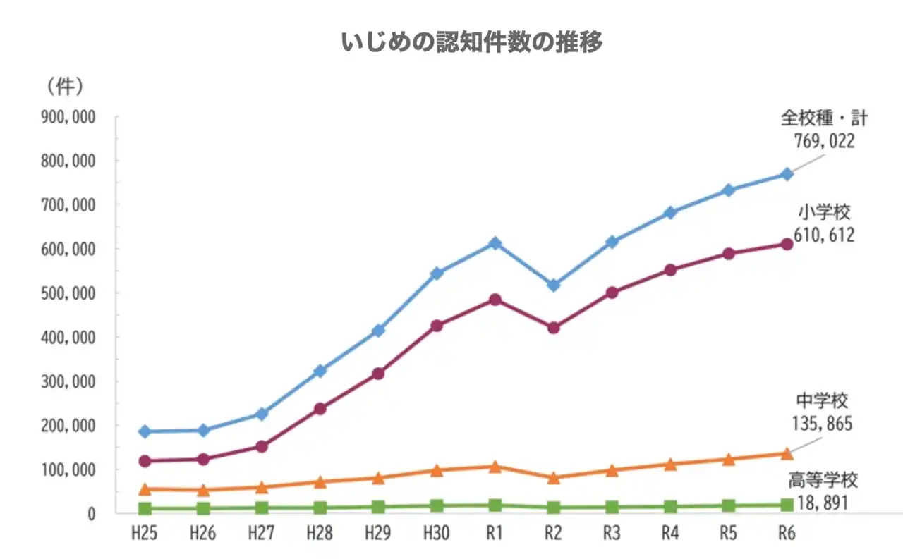 また、文科省によるといじめの認知件数も2024年度に過去最多を更新しています。 |
