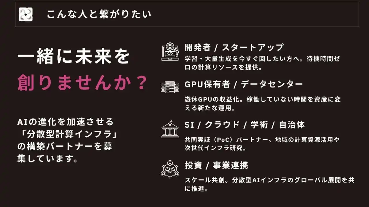 | 事業内容:分散型GPUの開発運用、独自ブロックチェーンの研究開発、Web3コンサルティング | |||