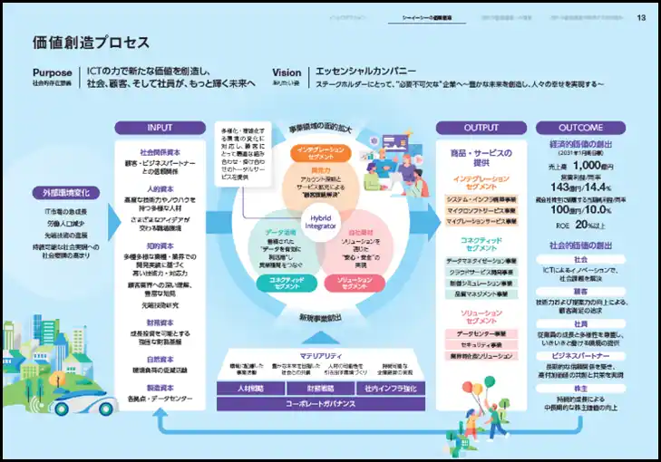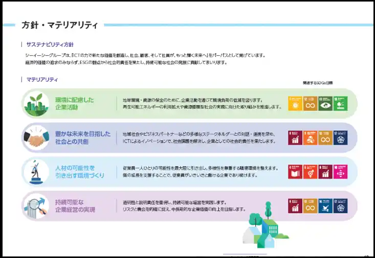 本報告書では、2025年3月に策定した長期経営計画「VISION 2030」と「中期経営計画 2025-2027」を紹介するとともに、シーイーシーが目指す「エッセンシャルカンパニー」の実現に向け、パーパスを起点に資本と事業活動の関係を示す「価値創造プロセス」を提示し、持続可能な経営に不可欠な「マテリアリティとその特定プロセス」なども掲載しています。 |