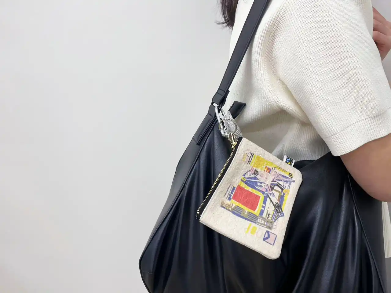 2年前は商品化に至らず悔しい気持ちがあったので、今回は必ず商品化させるという気持ちで参加し、「多くの方に使っていただける商品」をテーマに開始しました。ポーチ、サコッシュ、巾着袋の3候補が挙がった後は難航し、以前から交流があった大阪シーリング印刷さんに相談したところ、福祉施設をご紹介いただきました。施設の方より「障がいのある方は障がい者手帳を携帯されている」と聞き、手帳入れになるポーチに決めました。定期や小物入れにも使用できるサイズで、鞄の中で探さなくて済むようにカラナビを付けて利便性も考慮しました。 |