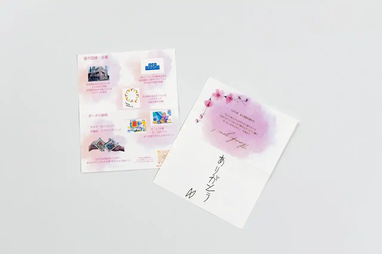 インドで生産した衣料品や雑貨などの商品を日本市場に紹介している株式会社スバストラジャパンが取り組んでいる産学連携プロジェクト「Stepping Stone」の一環で、学業とビジネスを両立させながらフェアトレードの認知向上とビジネス推進も目指すものです。名古屋外大の学生は企画、クラウドファンディング運用、販売、さふらん生活園のアーティストはイラスト制作、スバストラジャパンは商品作り、大阪シーリング印刷はラッピング用シールとカード、ヨナワールドはラッピング作業を担当し、産学連携に加えて福祉をつなげた商品です。 |