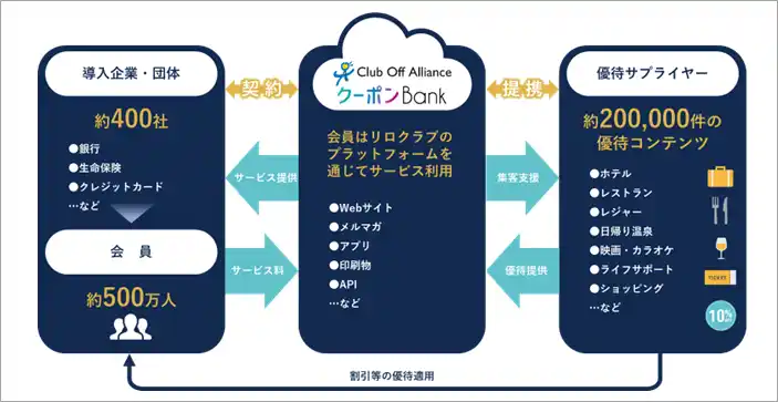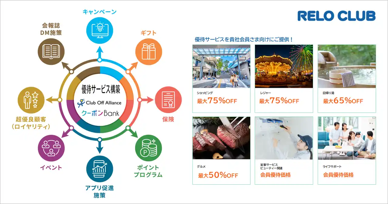 | さらに、リロクラブは会員優待サービス「クラブオフ(Club Off Alliance)」において、「福利厚生倶楽部」でのノウハウを活かし、企業の優良顧客の獲得・囲い込みを支援するCRMサービスを展開しております。企業のニーズに合わせた付加価値の高い顧客体験を創出し、顧客満足度(CS)の向上に貢献しています。 | |||||||||||||