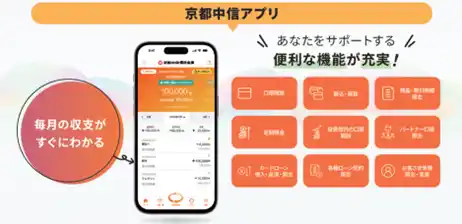 | 「京都中信アプリ」は、窓口へ来店することなく、「口座開設」や「振込・振替」、「残高照会・入出金明細」などの便利な機能であなたをサポート。自宅でも外出先でも、スマホで気軽に利用できます! | |||||||||||||