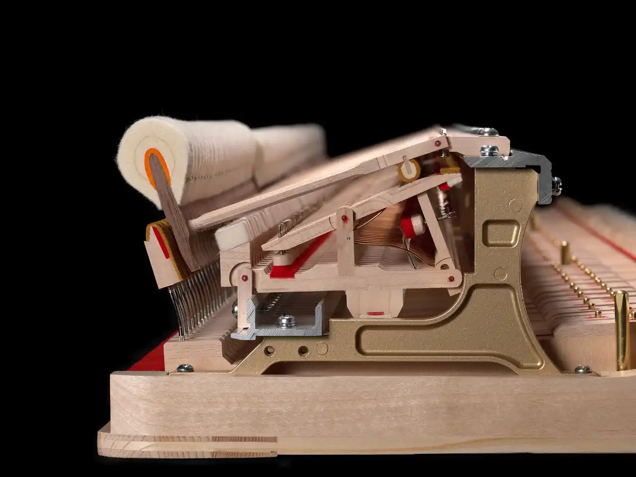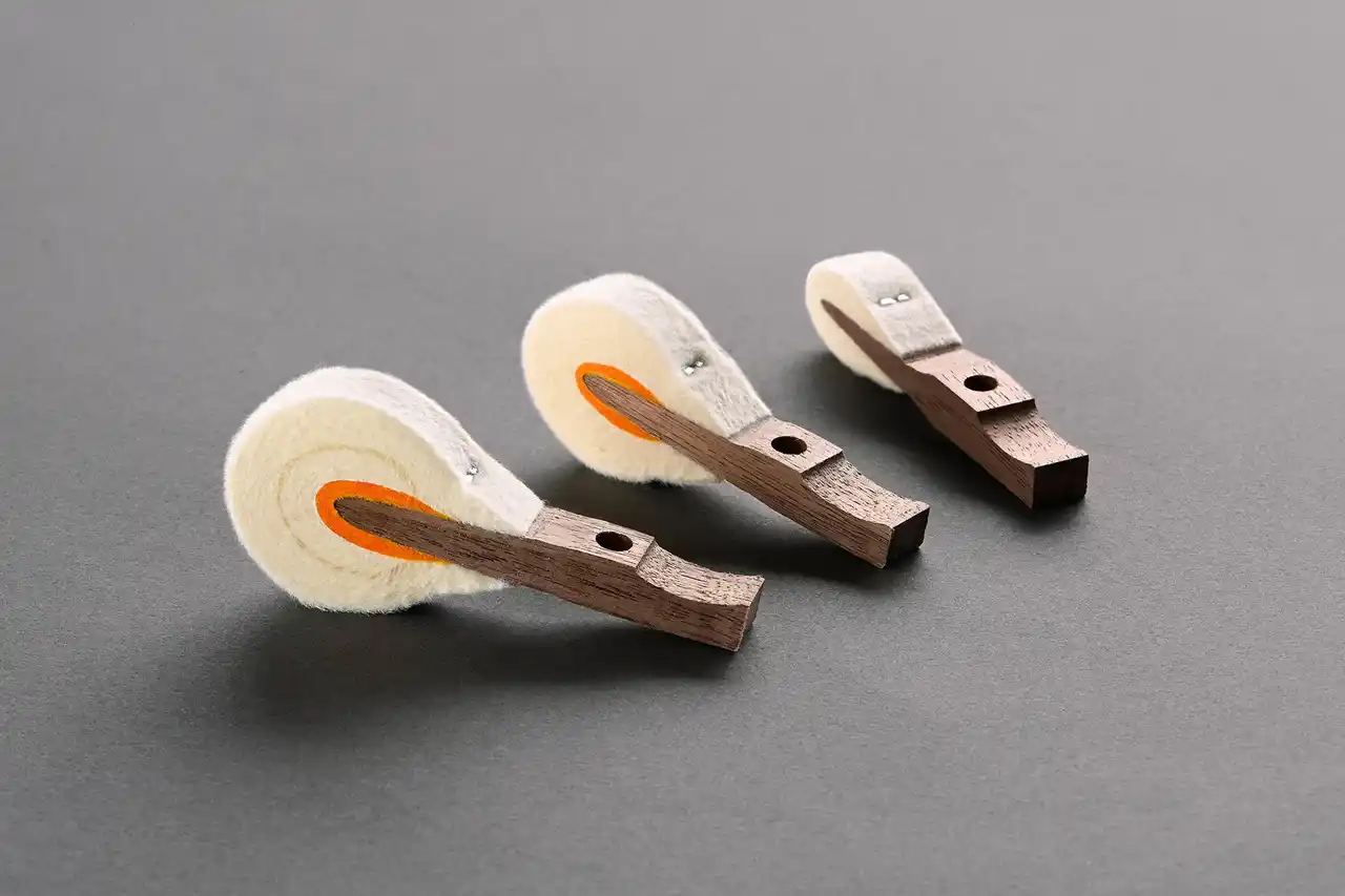 「CFX」と同じ素材(フェルト)を採用しました。原反の加工方法、貼り込み型の形状や貼り込み時の温度条件など、「CFX」の開発で得た知見を反映し、espressivo専用のハンマーを新たに開発。弱打から強打まで、また、低音から高音まで、音色のグラデーションと豊かな色彩感を実現しました。 |