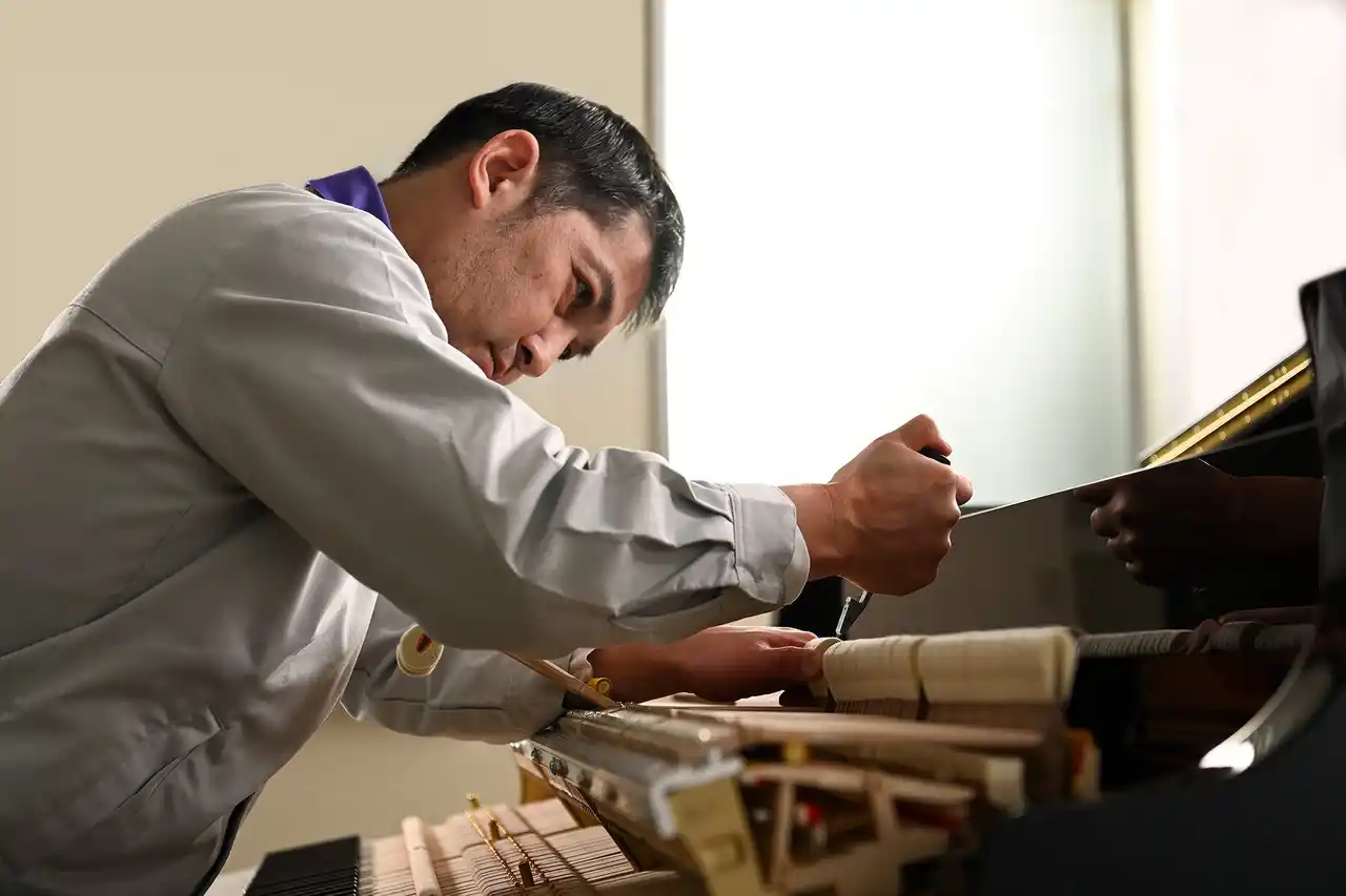 熟練の職人が多くの時間をかけて、ピアノ本体や細かな部品ひとつひとつの状態に応じて音作りやアクション機構の調整を精密に行うことで、一台一台のピアノの魅力を最大限に引き出します。低音から高音までバランス良く多彩に変化する音色や、繊細なタッチ感の細部まで手作業で整えます。 |