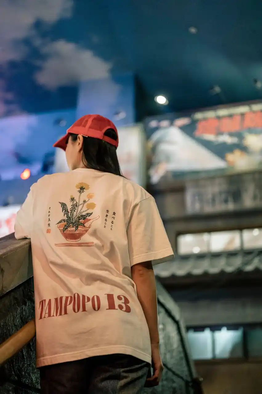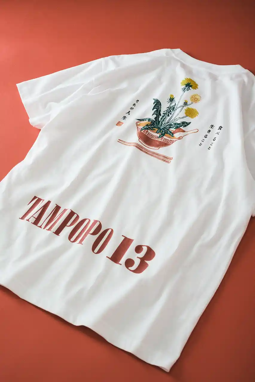 表紙イラストを手掛けたのはニューヨークを拠点に活躍し、ニューズウィーク日本版(2009)で「世界が尊敬する日本人100人」にも選出されたYuko Shimizu氏。書籍が映画『タンポポ』を介してテーマとした「食べること/生きること」を表現する、印象深いイラストをダイナミックにバックプリントしてTシャツ化。映画の公開40年目を機に新横浜ラーメン博物館のミュージアムショップでの取り扱いが開始しました。昭和のノスタルジーをモダンに纏う意匠は、新横浜ラーメン博物館の来館者、とりわけインバウンド客から好評を得ています。 |