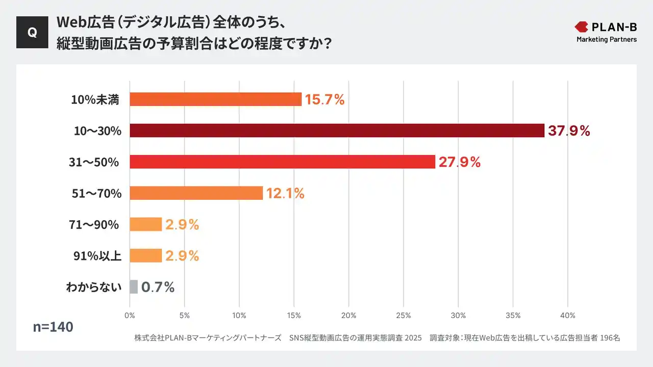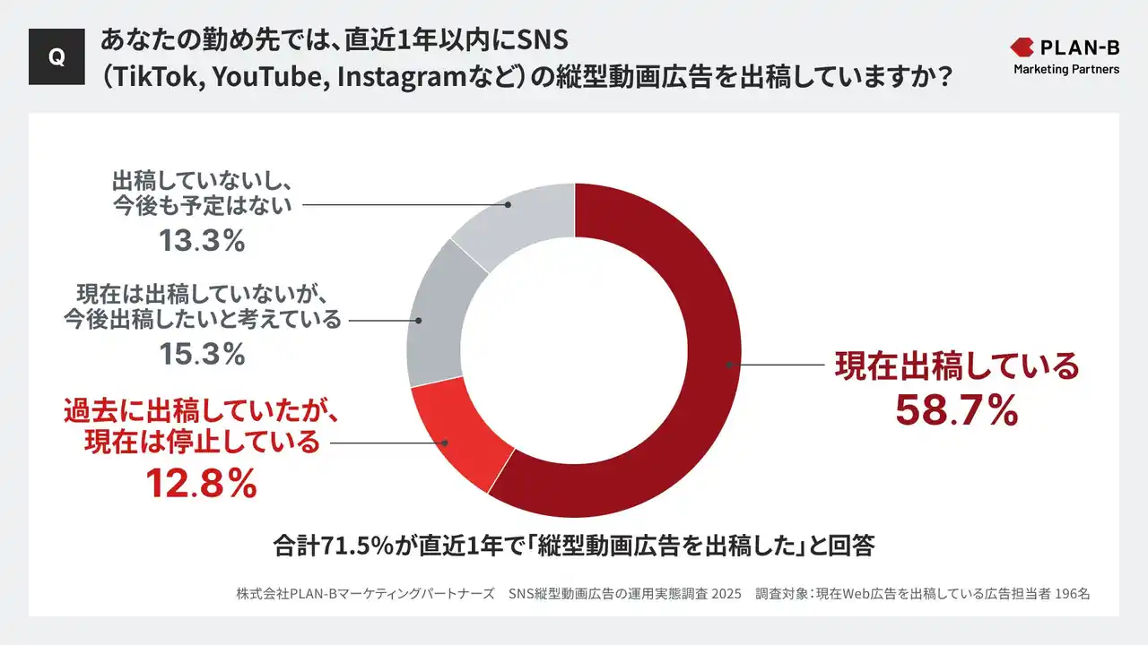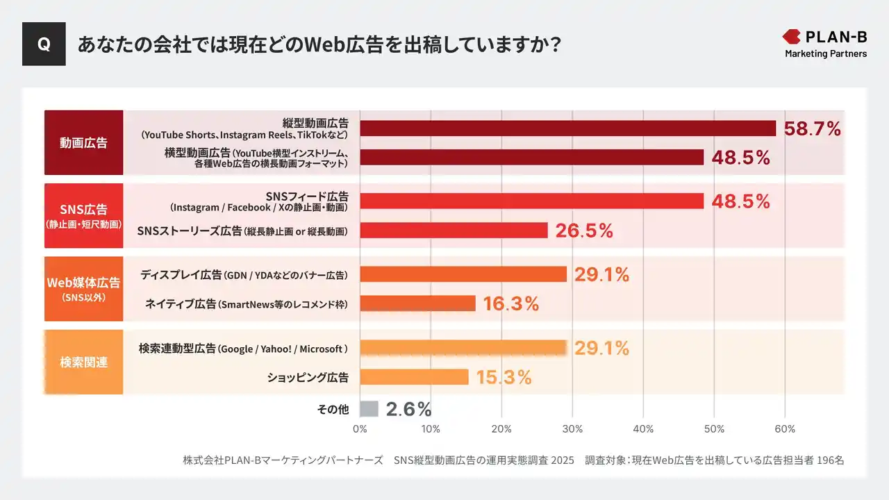 Web広告・SEOなどあらゆるデジタル領域のマーケティング支援を行う株式会社PLAN-Bマーケティングパートナーズ(東京都品川区、代表取締役:鳥居本 真徳)は、現在Web広告を出稿している全国の広告担当者196名を対象に、「SNS縦型動画広告の運用実態調査」を実施しました。 |