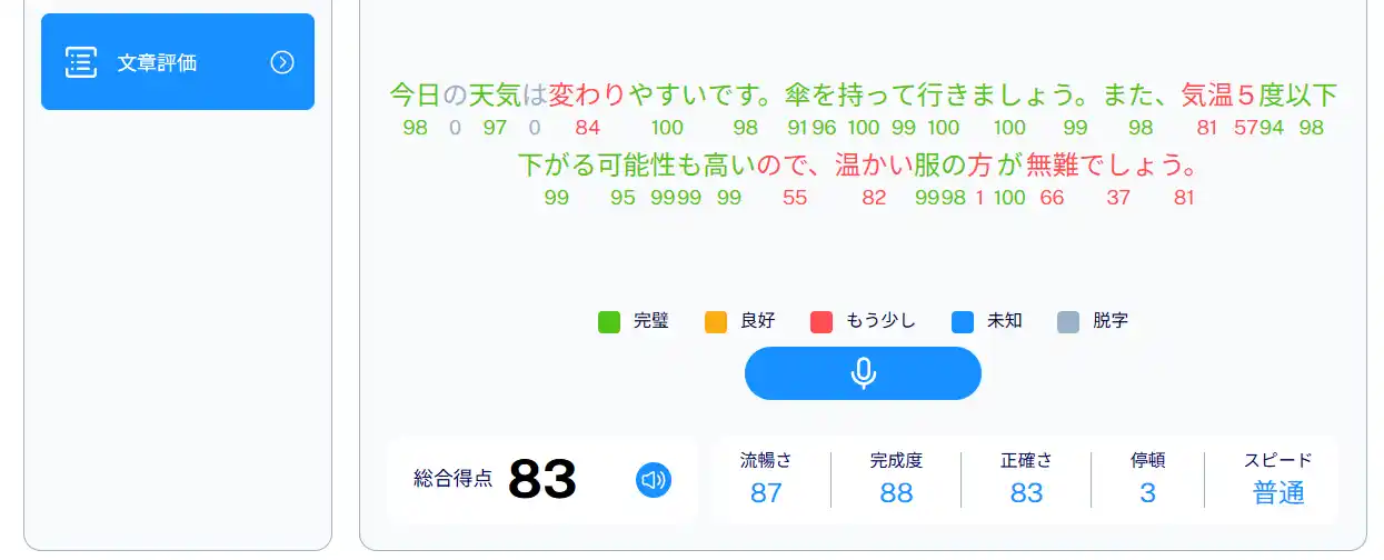 ・流暢さ評価:フレーズ全体のスムーズさ、自然な速度での発話を分析。発音の長さ60秒まで可能。 |