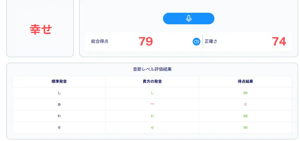 一つひとつの音素(例:「か」「き」「く」など)の発音を標準発音と比較し、正確さをスコア化 |