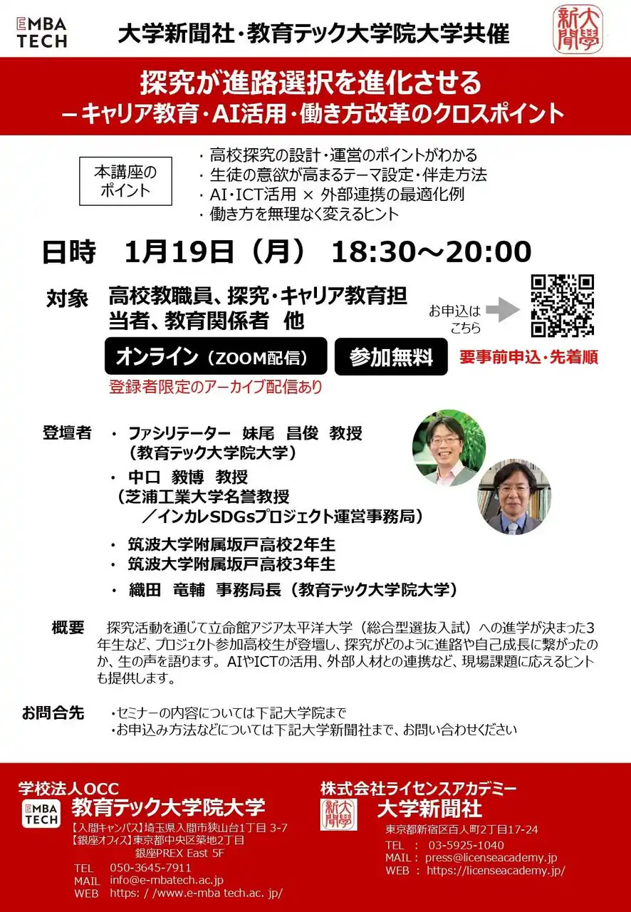 大学新聞社(株式会社ライセンスアカデミー内)と教育テック大学院大学は、2026年1月19日(月)に、教育関係者を対象としたオンラインセミナー「探究が進路選択を進化させる ~キャリア教育・AI活用・働き方改革のクロスポイント~」を共同開催いたします。 |