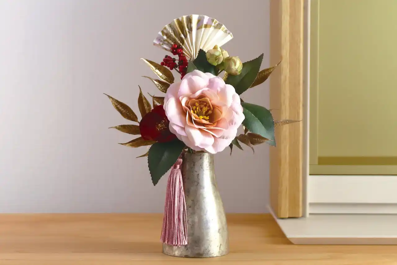 金のさし色と扇子の飾りが特別感のある「メモリアルフラワー正月花 絹」 |