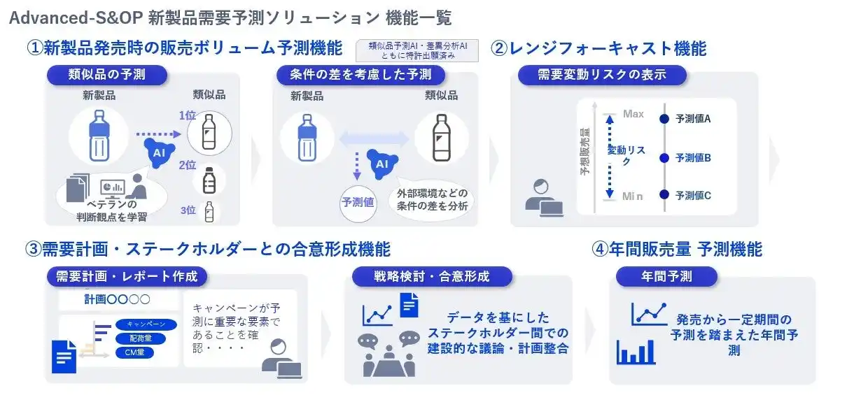 NECは、独自のAIを活用しステークホルダーの合意形成を予測で支援するAdvanced-S&OP 新製品需要予測ソリューションを販売しています。これまでの新製品開発においては、過去のデータが十分にないために、一般的なアプローチで「予測を当てに行く」ことは困難でしたが、AIを用いた予測値の提供、支援により誰でも同じ成果を出せるようにしました。 |