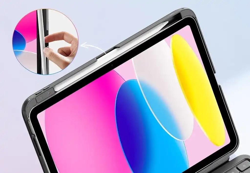 本製品はマグネットで簡単に着脱でき、キーボードを本体から離してワイヤレスタイピングが可能です。Apple Pencilの収納と2段階のスタンド角度調節で、作業や視聴にも快適に活用できます。 |