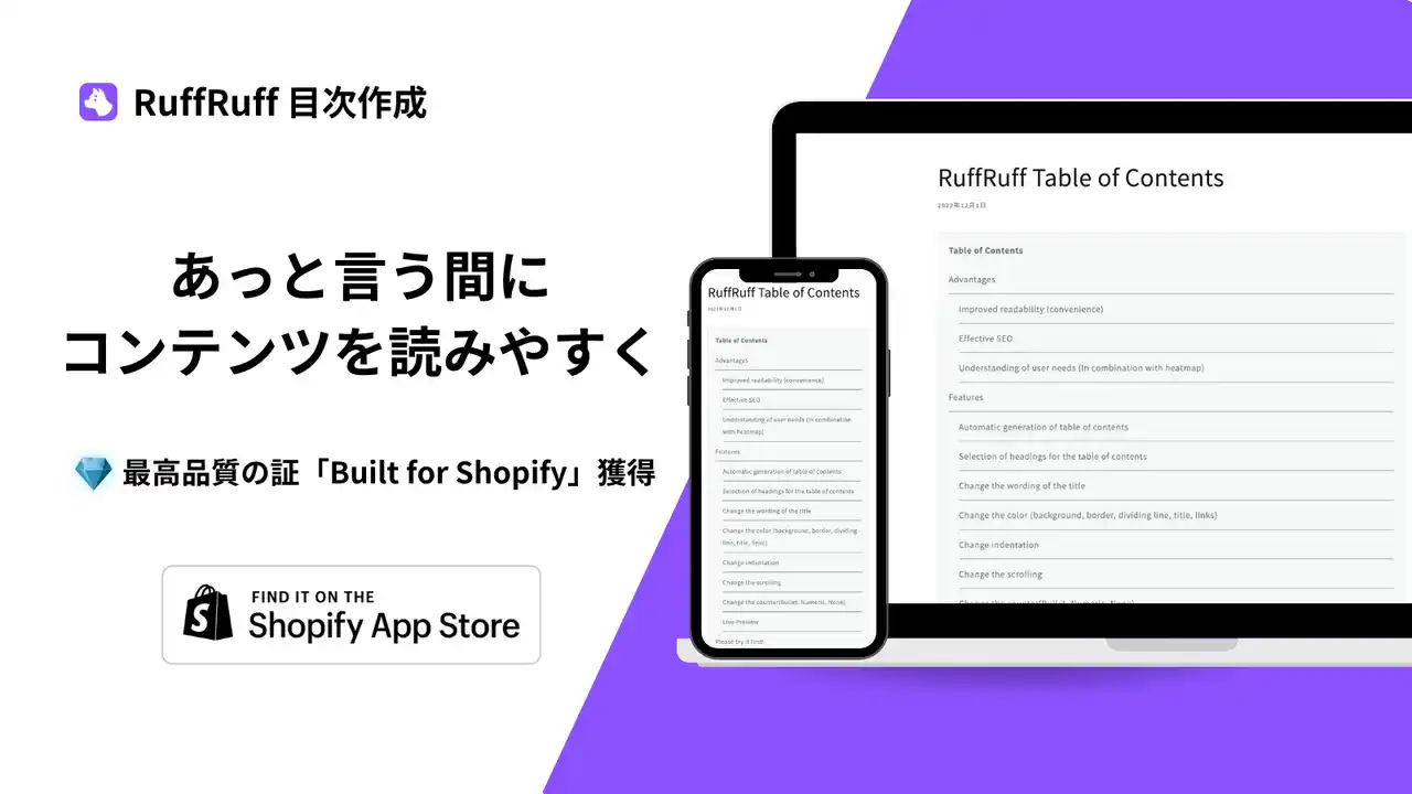 「RuffRuff 目次作成」は、ブログ記事や商品などのコンテンツに自動で目次を生成できるShopifyアプリです。 |