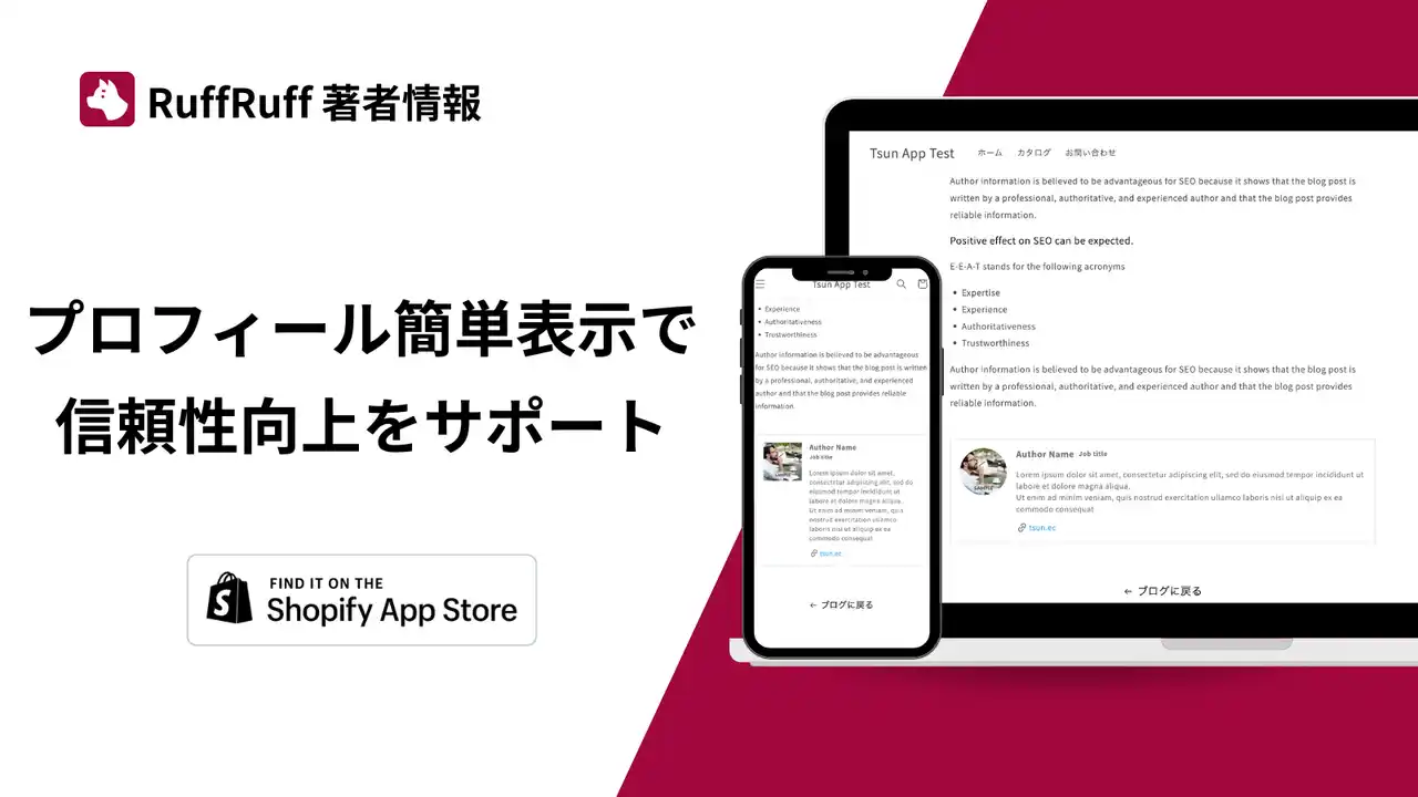 「RuffRuff 著者情報」は、ブログ記事や商品ページにプロフィール情報を簡単に掲載できるShopifyアプリです。 |