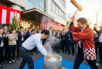 本格的な臼と杵、ハッピはもちろん、プロMCが実況中継で会場を盛り上げます。BGMや照明演出(オプション)も組み合わせ、古臭い行事ではなく「ライブ感あふれるショー」として開催。写真映えも抜群で、参加者の記憶に残る一日を創出します。 |