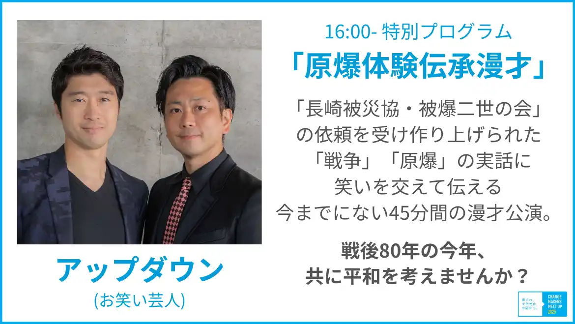 また、今回は戦後80年の締めくくりとして、平和をテーマにしたディスカッションも実施。全会場を繋ぐ特別プログラムとして社会派お笑いコンビ・アップダウンによる原爆をテーマにした「原爆体験伝承漫才」を上演します。この漫才は、長崎の被爆者団体からの依頼により制作された作品。戦争と平和を考える新たな表現として注目を集めています。 |