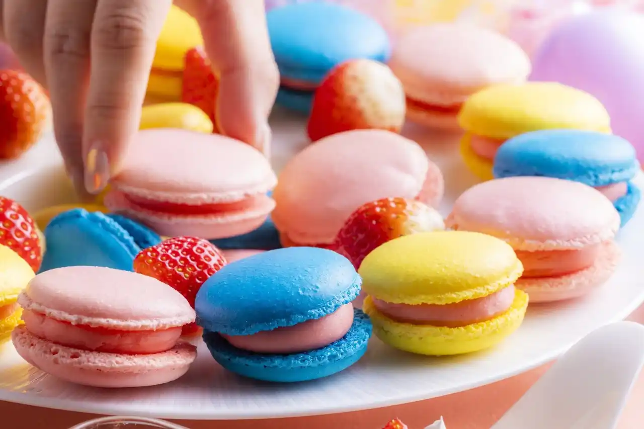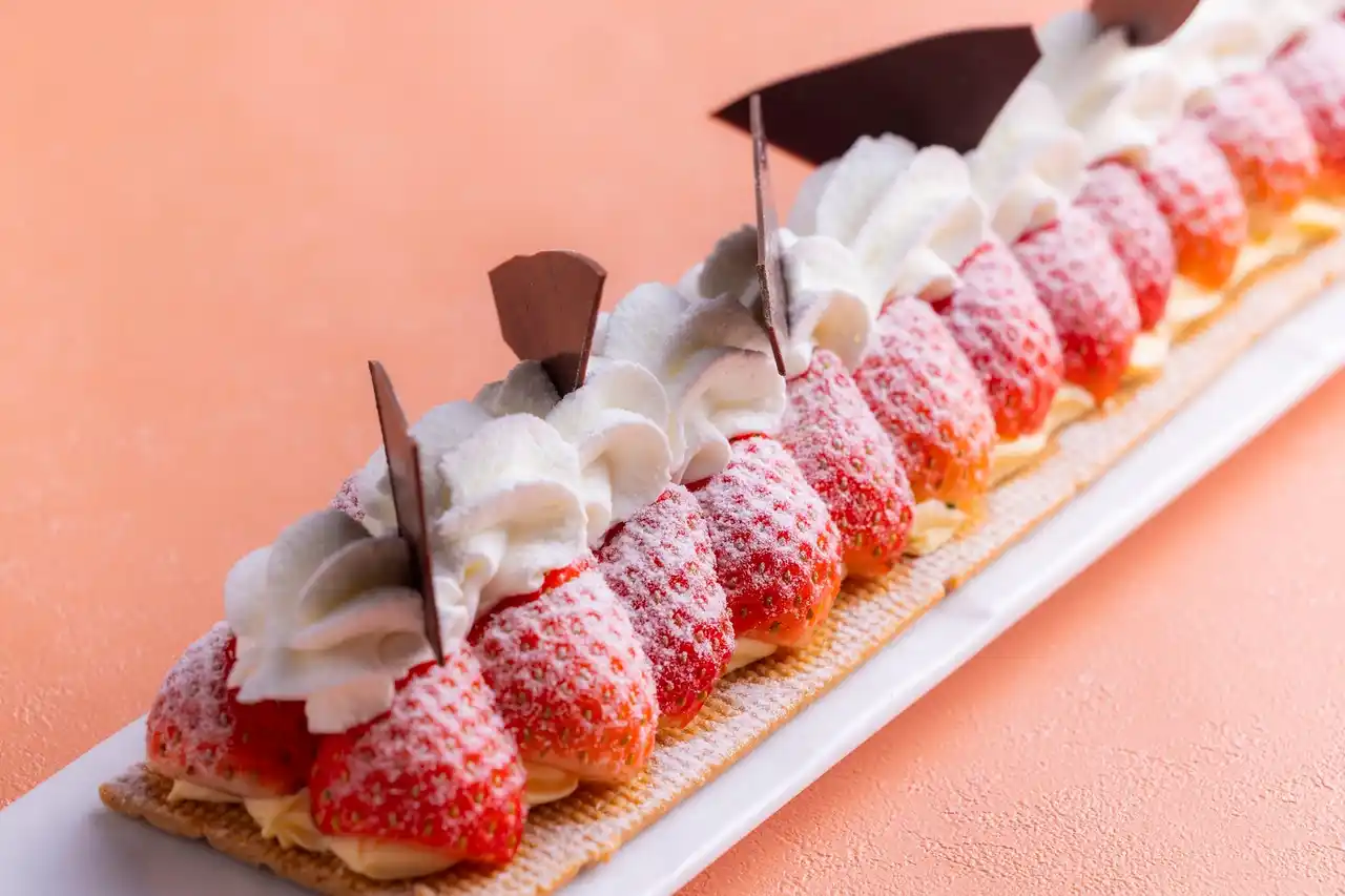 スイーツでひと際目を引くカラフルな「いちごのトゥンカロン」は、フレッシュいちごを挟んでおり、その可愛らしさは写真映え間違いなし。サクサクのクッキー生地にたっぷりのいちごを乗せた「ロングストロベリータルト」は、口いっぱいに広がるいちごを味わっていただけます。さらに、ライブステーションで仕上げる「いちごカスタードの絞りたてパイシュークリーム(ランチ限定)」は、美味しさだけではなく、オーダーしてから出来上がるまでのワクワク感も楽しみの一つです。 |