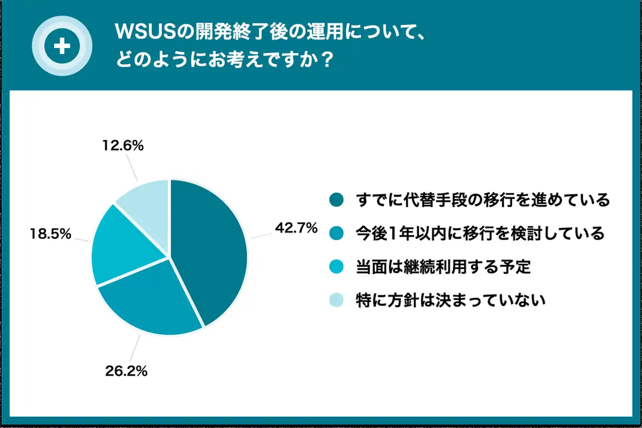 今回の調査では、WSUSの開発終了が十分に認知されていない一方、約7割が代替手段への移行を検討するなど、企業の更新管理体制を見直す動きが加速していることが明らかとなりました。特にMicrosoft