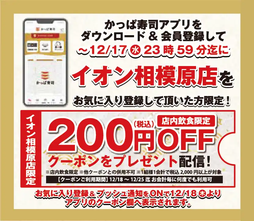 | ※公式アプリでの「かっぱ寿司 イオン相模原店」お気に入り登録者対象「店内飲食限定200円OFFクーポン」は12月17日(水)23:59までに「かっぱ寿司 イオン相模原店」をお気に入り登録した方へ配信いたします。 | ||||||||||||||||||