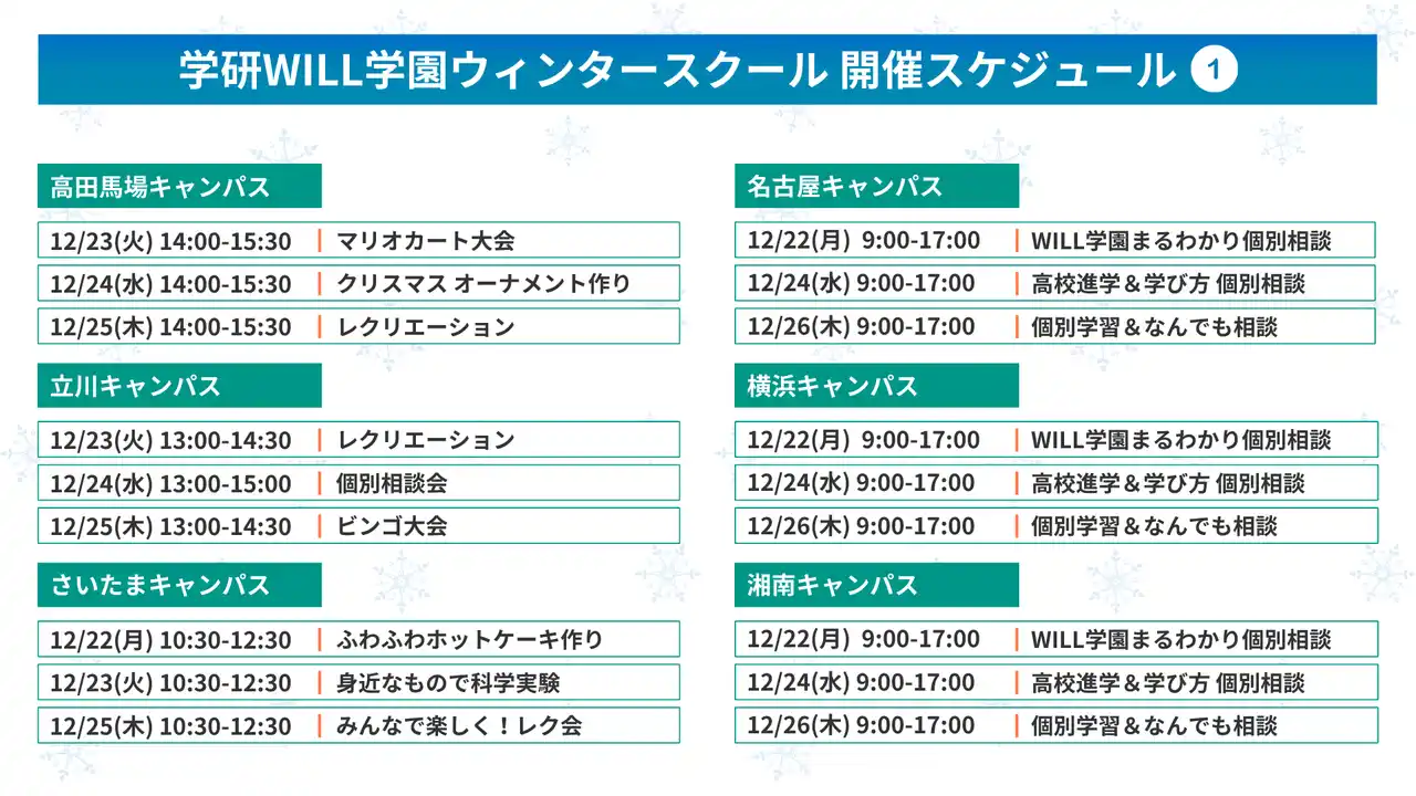 フリースクール・通信制サポート校である学研WILL学園は、冬休み期間に授業体験や体験型プログラムに無料で参加できる「ウィンタースクール」 を開催します。 |
