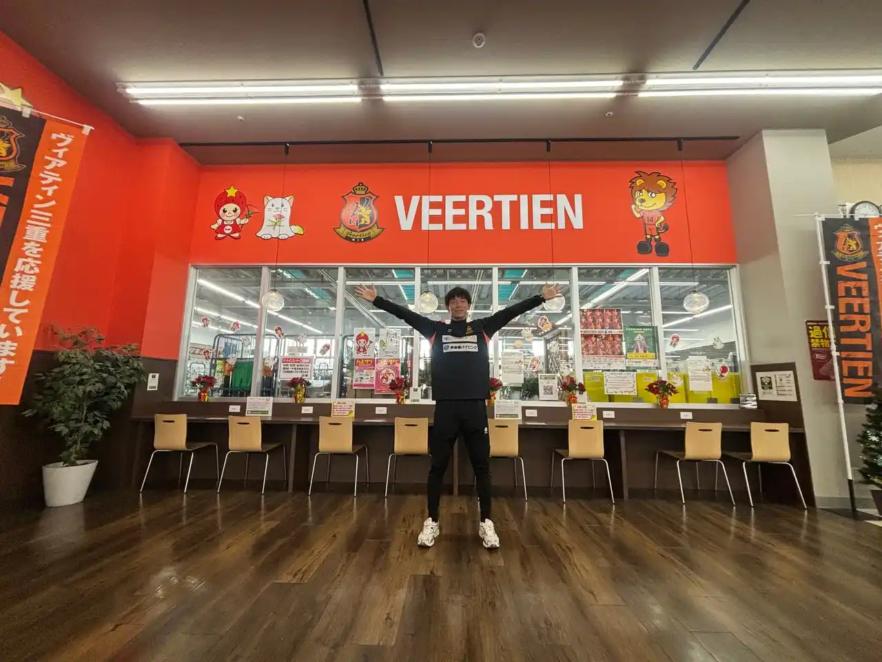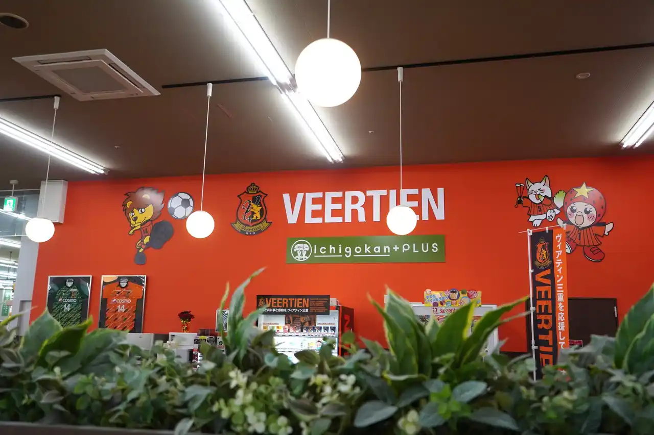壁面はクラブカラーのオレンジ色に塗装され、エンブレムやロゴを用いた装飾、ヴィアティン三重と一号舘のマスコットキャラクターがデザインされるなど、コラボレーションが行われました。その他、ヴィアティン三重の応援自販機も設置されており、地域の方が集まるスペースでクラブの後押しをしていただいております。 |
