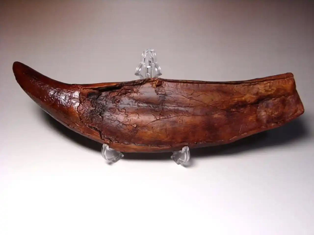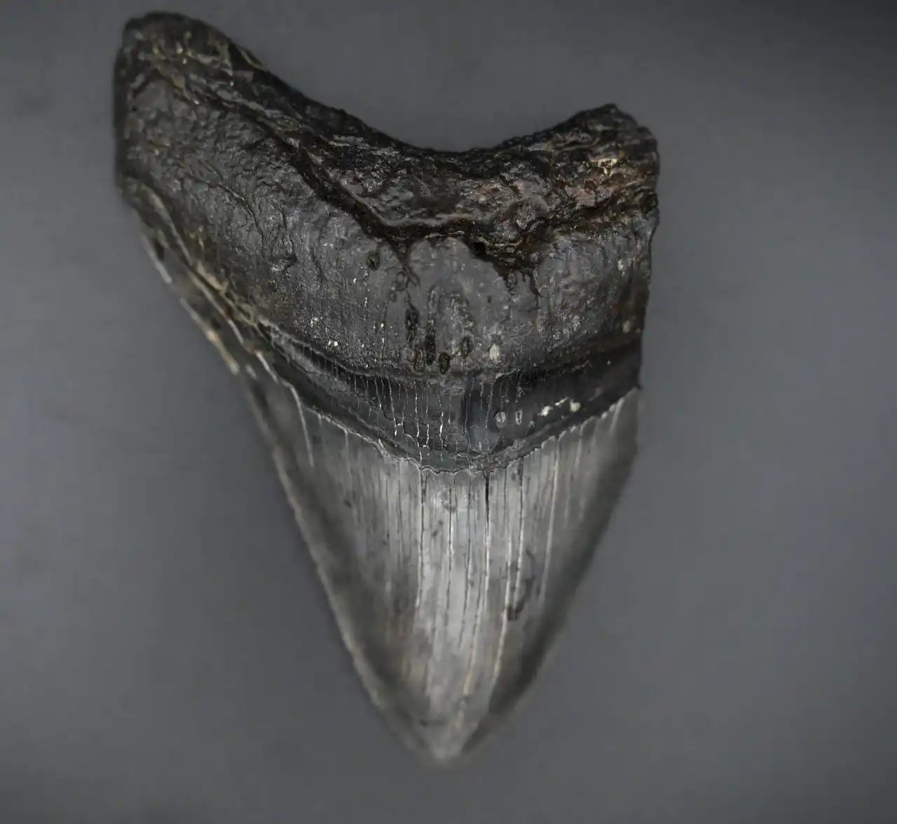 最大全長20m以上ともいわれています。このメガロドンの歯の化石は右側が欠けていますが、セレーション(ギザギザした形)も残っていて、しっかりと重たいことも特徴です。歯の厚みと滑らかな流線型が美しさを感じさせます。本物の化石です。 |