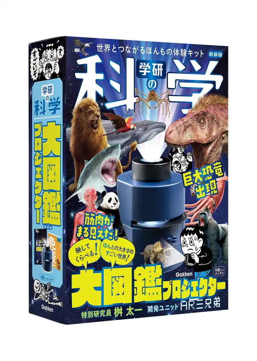 おうちの中がほんとの大きさ図鑑に変身!「大図鑑プロジェクター」は、かべや天井をスクリーンにして、ほんとの大きさで生きものを映したり、リアルな星空を投影したりできるプロジェクターです。組立時間の目安は15分。付属のシートは8種類あります。ティラノサウルスやホホジロザメの口に頭を入れるなどして遊べる! まるでほんものの世界に入りこんだような体験ができるキット。 |