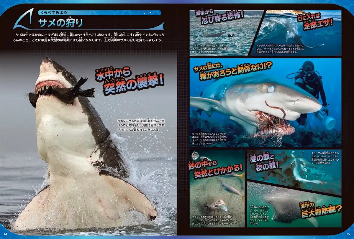 また「サメの飼育種類数日本一(約60種)」で知られる「アクアワールド茨城県大洗水族館」のバックアップにより、大迫力の実物大撮りおろし写真やバックヤードの情報も収録。 |