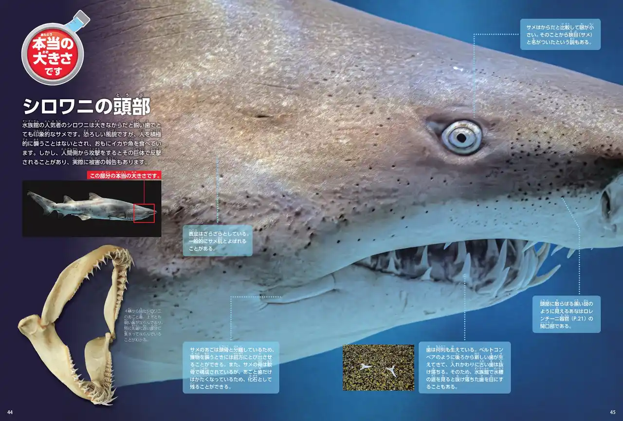 歯、感覚器、繁殖、古代ザメなど、多方面からサメの“海の王者”たるゆえんを徹底解説しています。 |