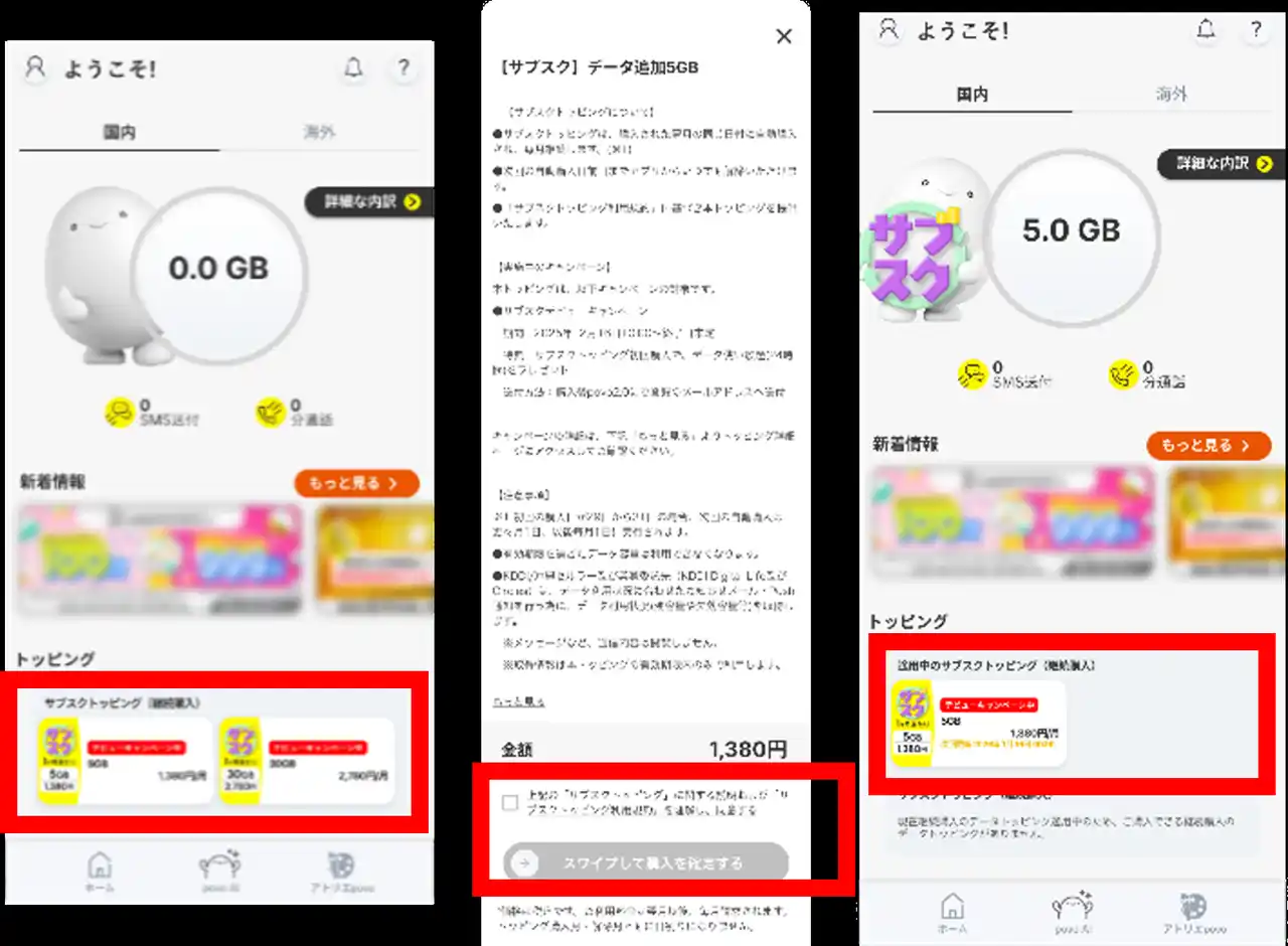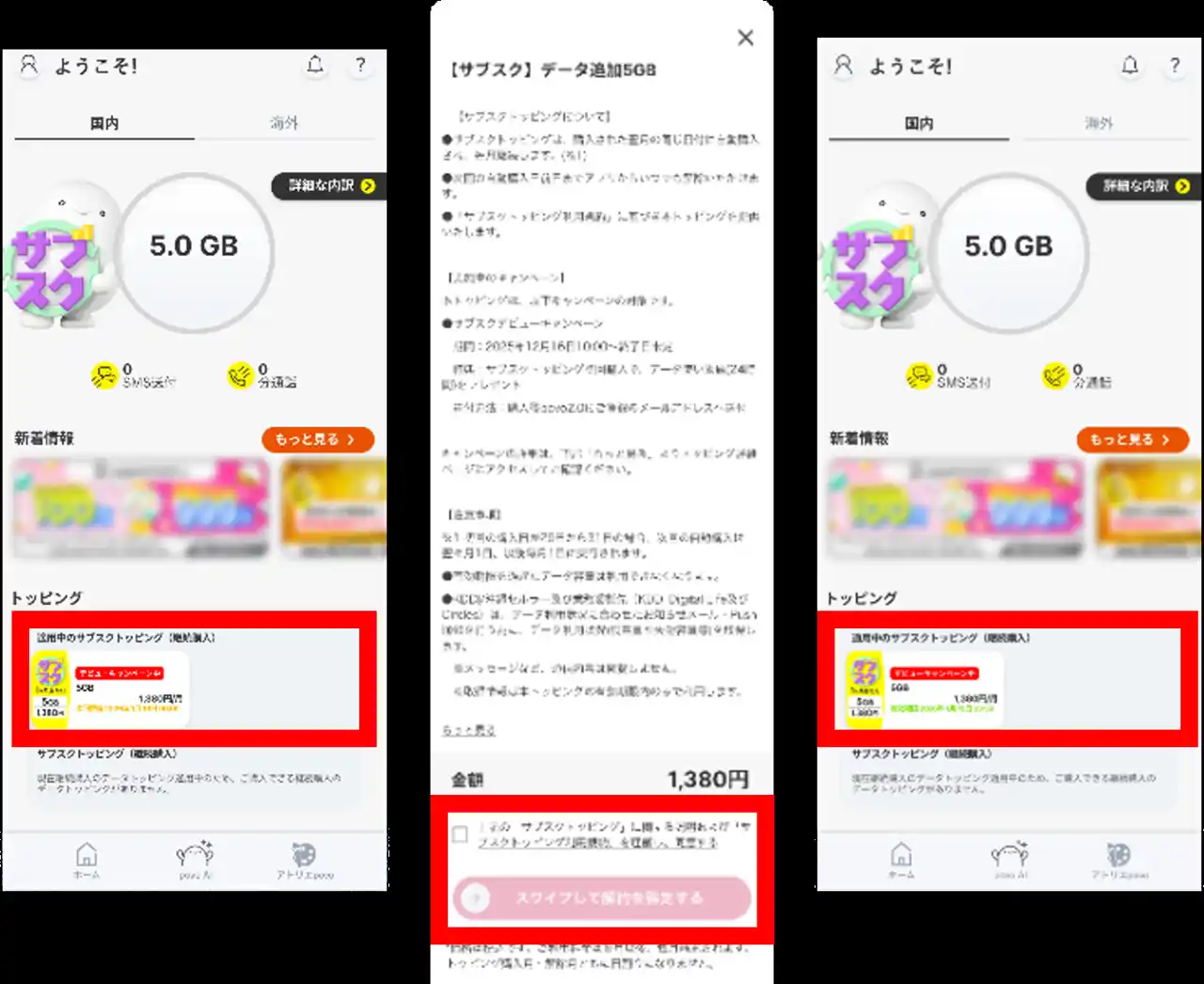 「サブスクトッピング」を購入いただくと、翌月以降は毎月同じ日(注3)に自動でトッピングが購入され、データがチャージされます。なお、自動購入の前日および自動購入後にpovo2.0に登録されたメールアドレスにお知らせします。データ容量の有効期限は、購入から1カ月です。 |