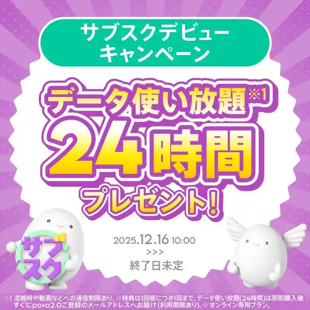 また、「サブスクトッピング」の提供開始を記念し、購入者全員に「データ使い放題(24時間)」(注1)(注2)のプロモコードをプレゼントする「サブスクデビューキャンペーン」を実施します。 |