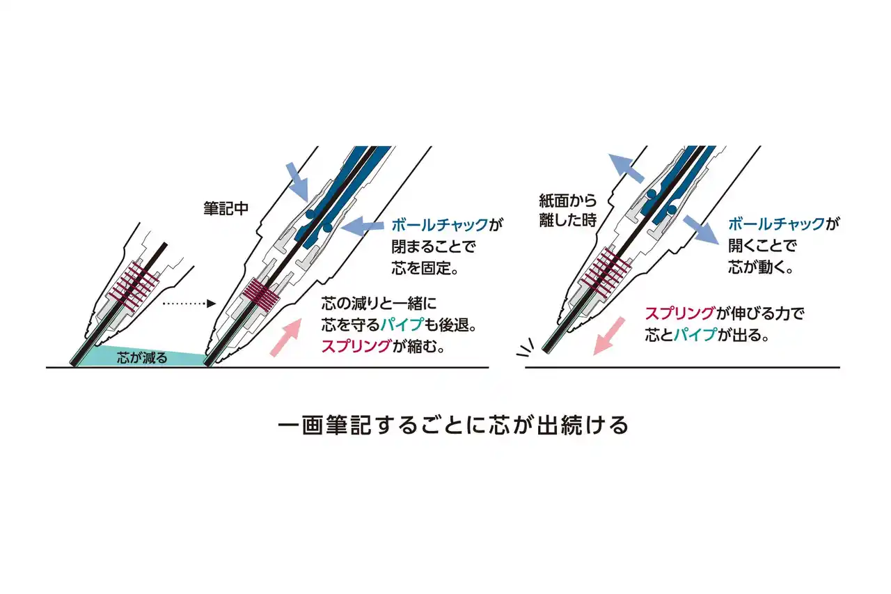 ・ノック1回でずっと書き続けられる「自動芯出し機構」 |