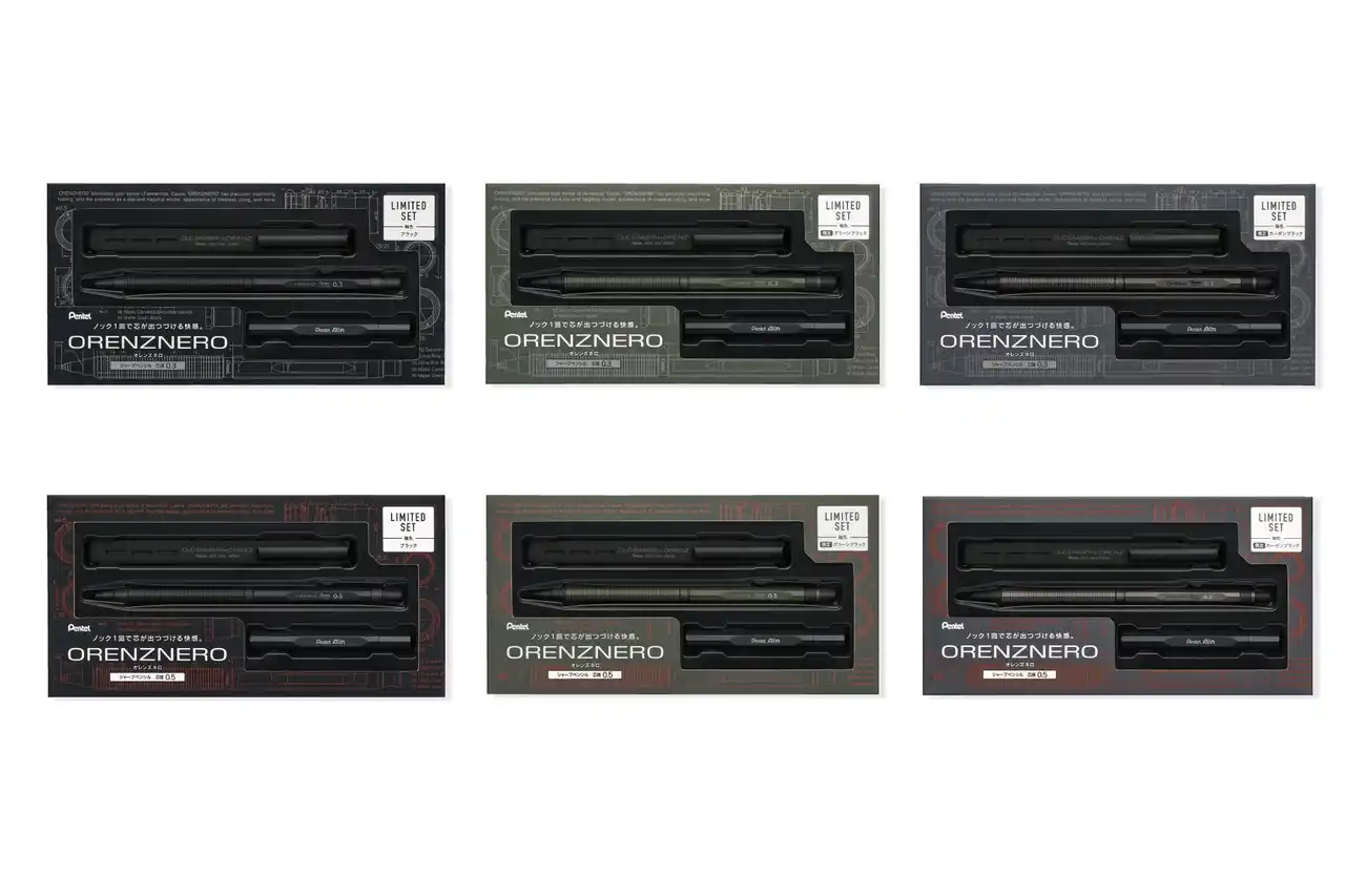 この度、オレンズネロの「所有感」や「存在感」といった世界観を継承し、名前の由来である「黒(NERO)」にこだわった、限定カラー2色を含む限定セットを発売します。ラインナップは、定番の「ブラック」、静けさと深みのある「グリーンブラック」、ぺんてるが誇る高品質なシャープペンシル替芯を想起させる「カーボンブラック」の3種類で、いずれも限定の金属製替芯ケースとホルダー式消しゴムをセットにした、限定パッケージで販売します。 |