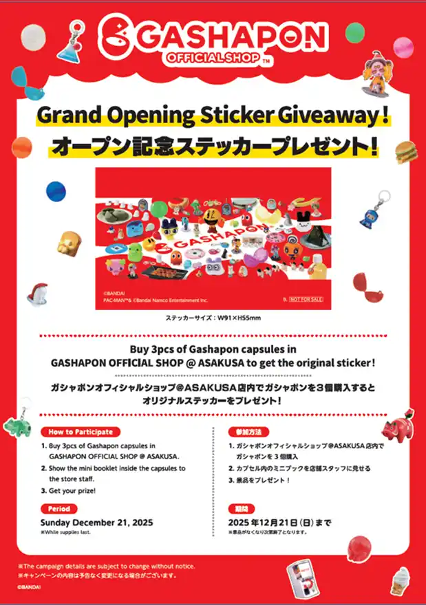 オープニングキャンペーンとして、ガシャポンオフィシャルショップ@ASAKUSA店内でガシャポンを3個ご購入いただいた方に“オリジナルステッカー”をプレゼント! |