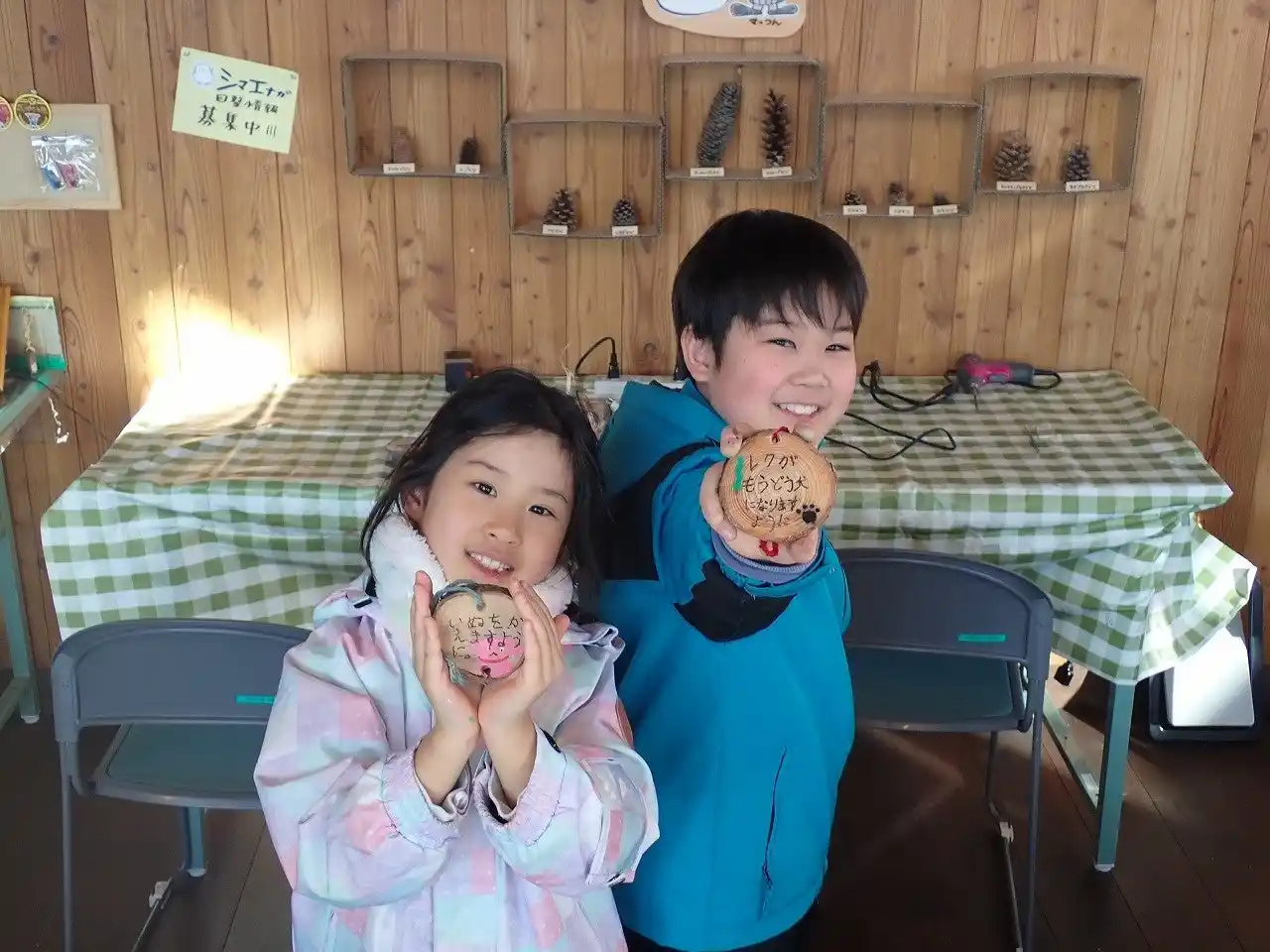 自分で選んだ木をノコギリで切って輪切りにしていただき、ヒモを通す穴を開けてマジックで夢やイラストをかいて完成です! |