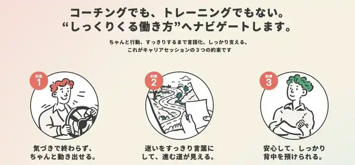 キャリアセッションは、自分の内面と丁寧に向き合い、選択肢を整理し、行動し、定着していく、その旅路に伴走する新しいサービスです。 |