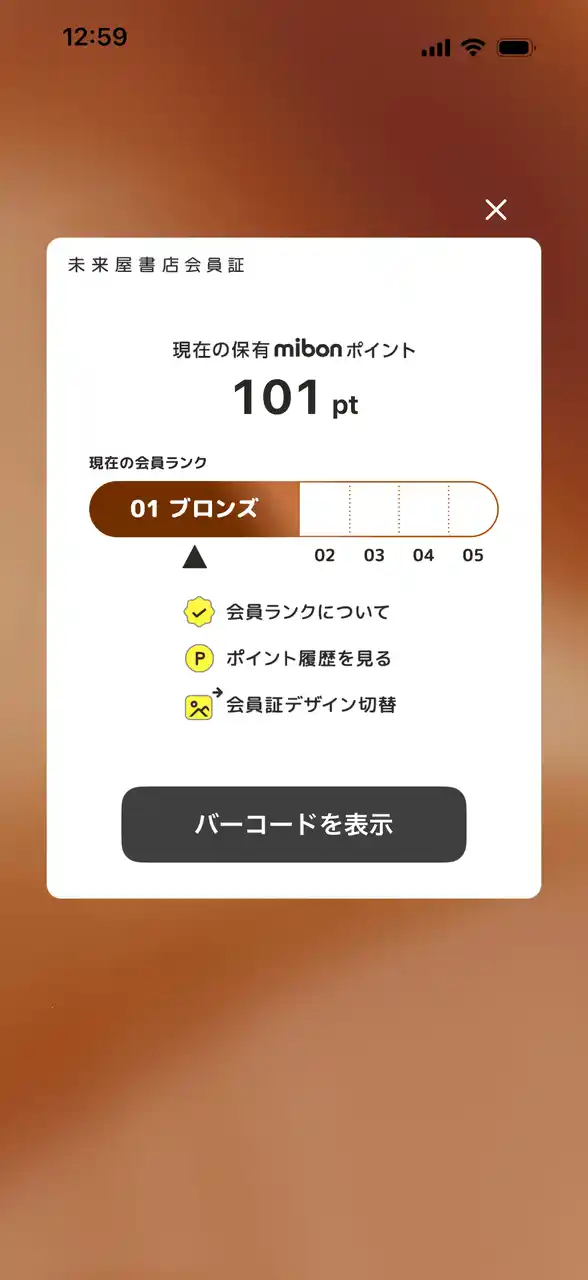 未来屋書店公式アプリの最大の特徴は、ご購入で獲得したポイント数に応じて会員ランクが変動する「会員ランク制度」の導入です。ランクが上がると、お買い物で貯まるmibonポイントの還元率がアップし、最大で5倍になります。 |