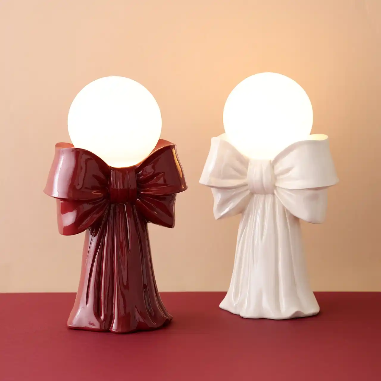 リボンモチーフの、インテリアオブジェのようなテーブルランプです。一つで存在感があり、お部屋のワンポイントになるフォルムが日常にときめきを与えてくれます。電池またはUSBで点灯できるので、デスク周りやチェストの上など、お好きな場所に飾ることができます。 |