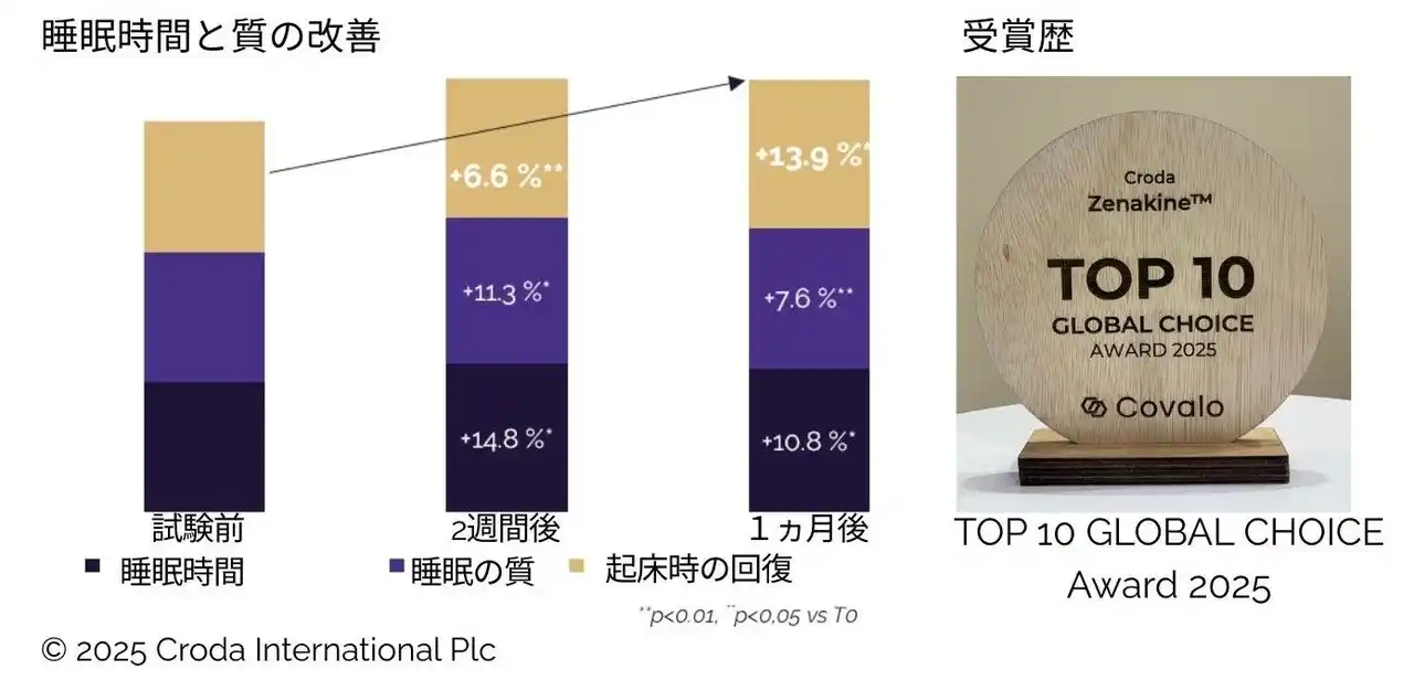 クローダジャパン株式会社(本社:東京都新宿区、代表取締役:リュー・ヨンチュアン)は、睡眠の質に着目し、睡眠中の肌再生とウェルビーイングを同時にサポートする新しい化粧品原料『ゼナカイン Zenakine(R)』を発売いたします。「もし、眠っている間にきれいになれたら」そんな多くの人が抱く願いを、ニューロサイエンスと皮膚科学の融合によって具現化したのが、夜美容原料『ゼナカイン』です。 |